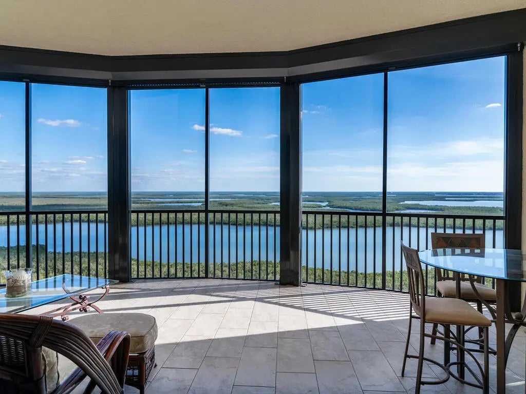 Prestigious Penthouse offers the pinnacle of luxury living. Enjoy glorious views from every window, sunrise to sunset, from Gulf to Bay, Marco's skyline to nature's wonderland. Secure elevator transports you to your private retreat in the sky. This mostly furnished expansive 3-bedroom, 3.5-bath residence features exquisite backgrounds & rich hardwood floors throughout by Clive Daniel completed in 2024. Designer ceiling fans & lighting, remote control Hunter Douglas luminettes & silhouettes. Private foyer/lobby with exquisite marble flooring greets you. Your grand & gracious Great Room, with ceilings soaring to nearly 12 ft, opens to an expansive screened Lanai perfect for entertaining. Custom built-in cabinetry including fireplace & wine refrig grace the Family Room. State-of-the-art Kitchen is a chef's delight with new one-level quartz bar, tile backsplashes, handsome hardwood cabinetry, custom slide-outs & drawers, pantry with slide outs, new fabulous Dacor refrigerator/freezer, KitchenAid Double Oven & cabinet faced Dishwasher. Pamper yourself in your ensuite Master Bath with separate spa tub & shower with multiple shower heads, his & hers hardwood vanities with granite counters, dual custom built-in walk-in closets. Split bedroom plan offers privacy with two delightful guest suites, each with ensuite baths & balcony. Exquisite Powder Room with marble walls & floor, designer ''bowl'' sink & vanity pull-out shelf. Handy Laundry Room with lots of built-ins, laundry tub & under counter Whirlpool washer & dryer. Impact glass throughout plus electric storm shutters to enclose Lanai for added security and convenience. Wired for Sound and Security Systems. Abundant storage space. The luxurious Lesina offers residents outstanding amenities including beautiful Lobby, well-appointed Social Room with Kitchen, bar, game tables, billiards, & big screen TV, Theater, Library, Fitness Center, two Guest Suites, Clubhouse, Resort-style Pool & Spa with Cabanas, secure garage 2 parking spaces, #60 and 68, and storage cage # 96, located left of Parking #60, bike storage, dog park. A secure, gated community, just minutes from Marco and Naples, Lesina is an exceptional value in luxury living in Collier County and PH 2105 is the best of the best!