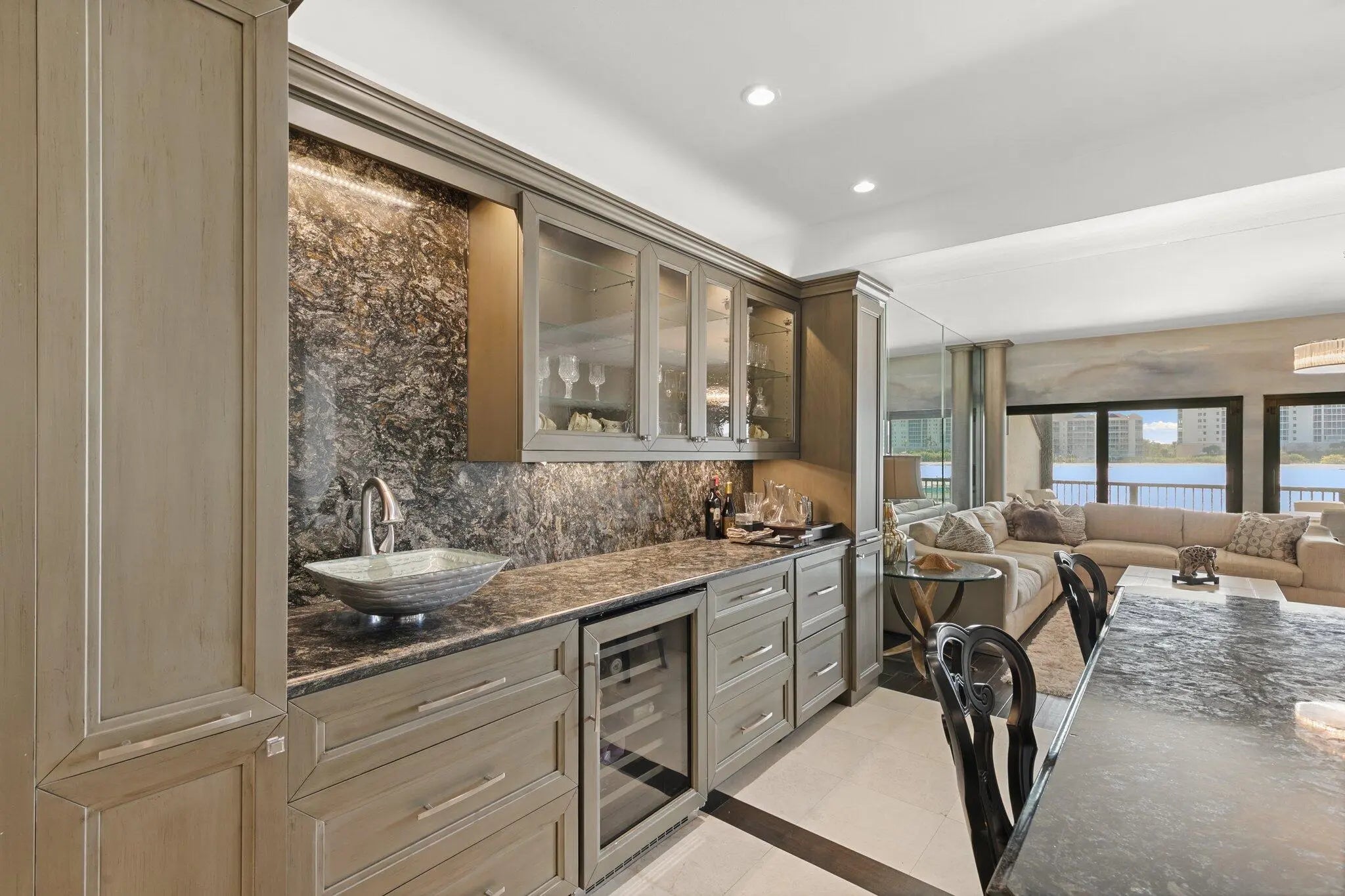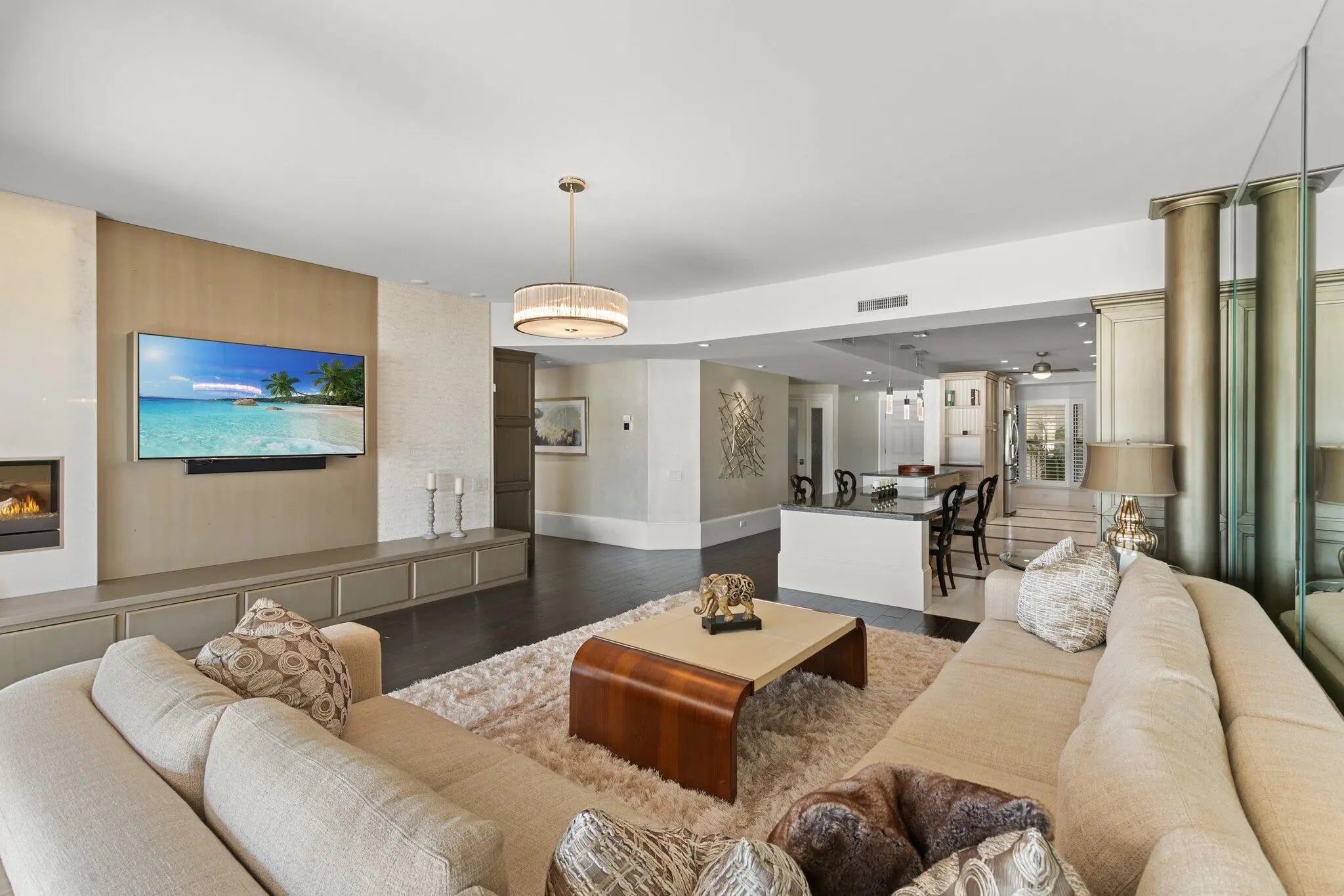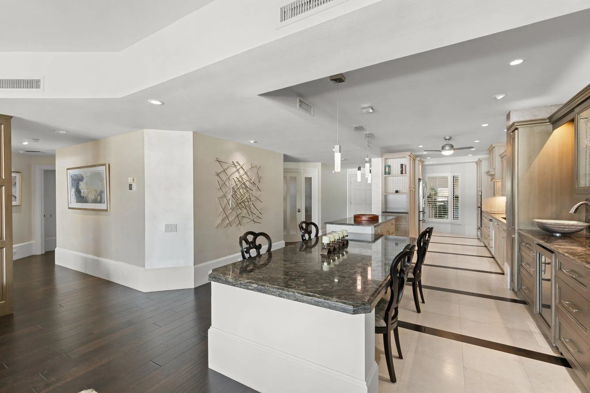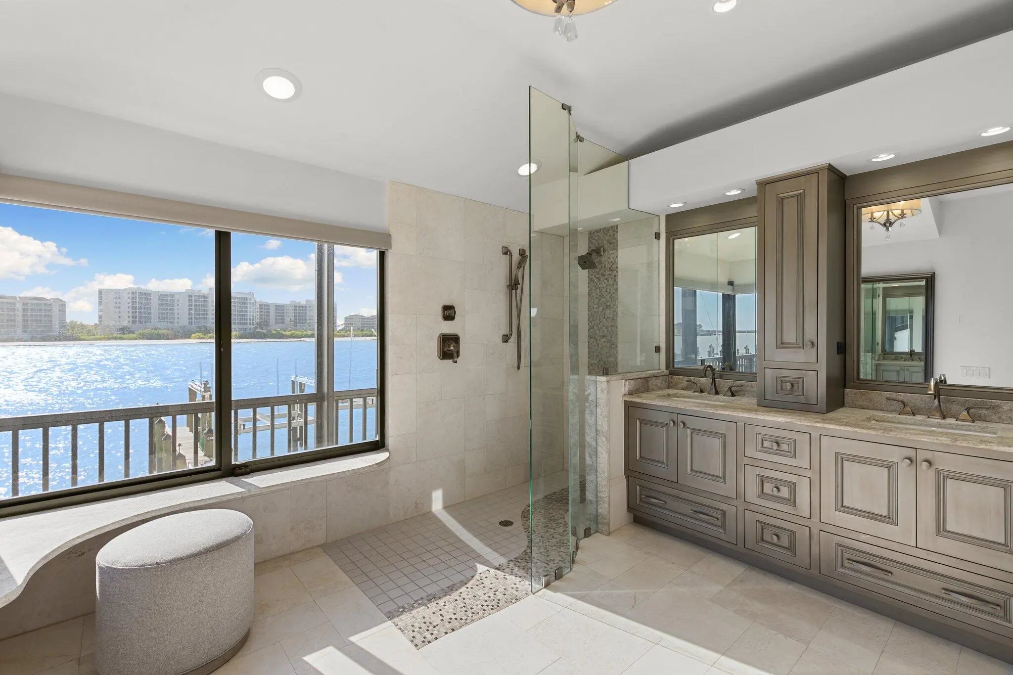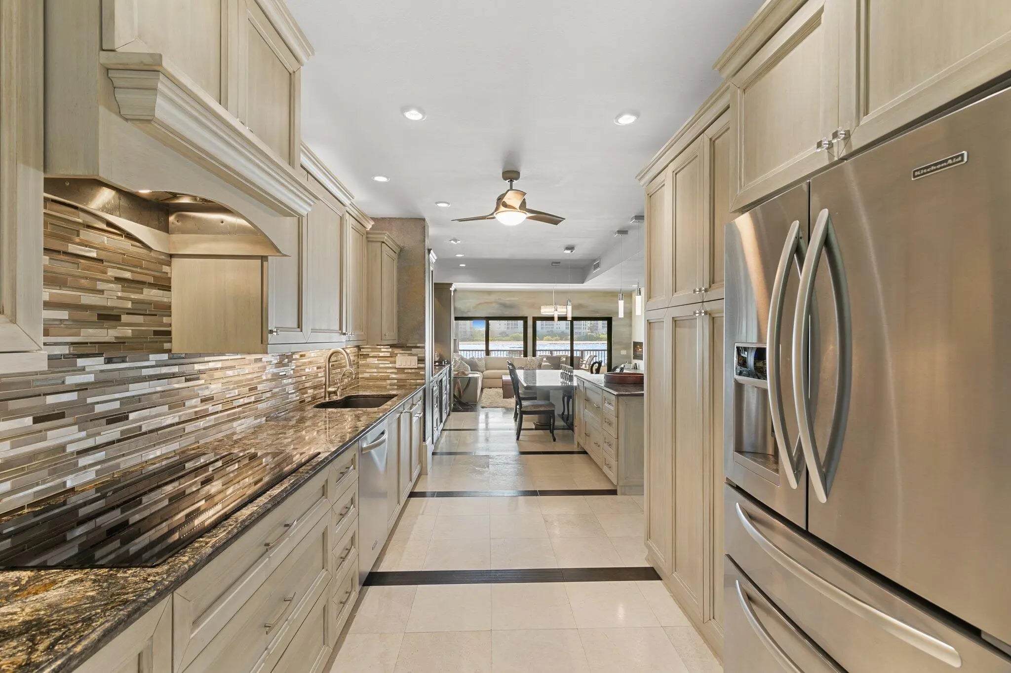 Welcome to this completely renovated, furnished 'Savoy' floor plan condo in the sought-after La Peninsula complex, located on the beautiful Marco River in Isles of Capri. This stunning 2-bedroom, 3-bathroom unit with a den offers a bright southern exposure and breathtaking views of the Marco River and Gulf of Mexico from the ample 400 sq ft lanai, living room, master bedroom and bathroom. Fully remodeled $300k+ by professional designer to a classic, long lasting style, with all renovations completed to code and fully permitted. The extensive renovation features high-end finishes throughout, including Italian marble, hardwood floors, and frameless glass showers. The gourmet kitchen is a chef's dream with custom hand-painted Alpine cabinets made from solid birch with slow motion closing doors & drawers, and granite countertops, and textured Spectrum glass solid wood doors. Every detail of the remodel has been carefully considered, with luxury appliances and BRIZO and KOHLER premium plumbing fixtures. Notable features include storm impact windows and doors with certification and premium window shutters, dimmer switches on all LED lighting. High-end luxury CARACOLE furniture in living and master bedrooms, and BROWN JORDAN outdoor furniture. The lanai is the only one in the complex with remote-controlled, retractable screen and shade awning, adding privacy, comfort and convenience. A full laundry room, like in a traditional home, completes the unit's thoughtful design. The original three bedrooms have been reimagined into two spacious bedrooms and a den, which can easily serve as a third bedroom or office. The 400 building notably was the most recently built in the complex, in 1995. It has passed its 'Milestone inspection,' had a new roof installed in 2019 and offers the most guest parking in the complex. Unit 406 installed a power surge protection device to protect a/c and major appliances in the unit. This condo also enjoys assigned covered parking, additional temperature controlled locked storage, a fitness center, and access to a community pool and spa. For residents' use and enjoyment, La Peninsula has a 1/2 mile concrete pedestrian path that runs along the waterway for an up close view of boats, dolphins, turtles, manatees and all the sea life. With stunning views, luxurious upgrades, and modern amenities, this turnkey condo is a true gem in Isles of Capri.