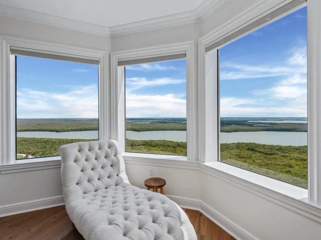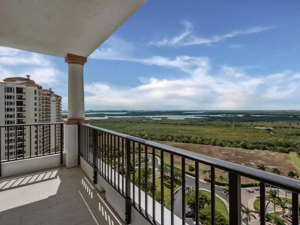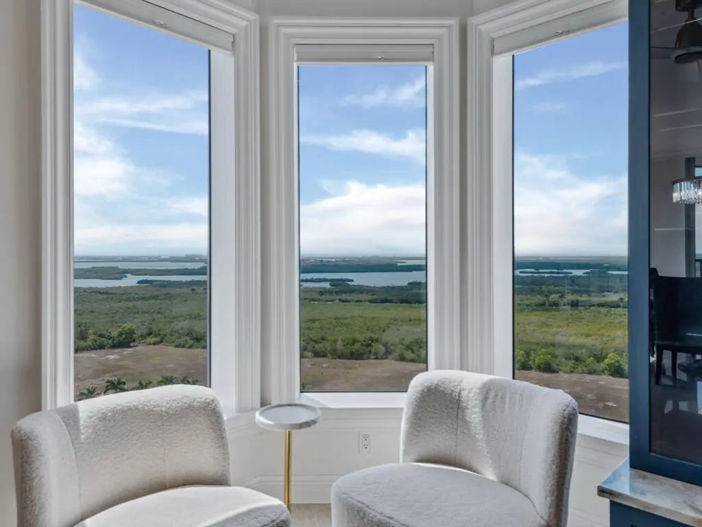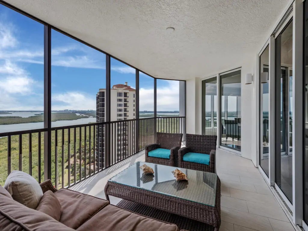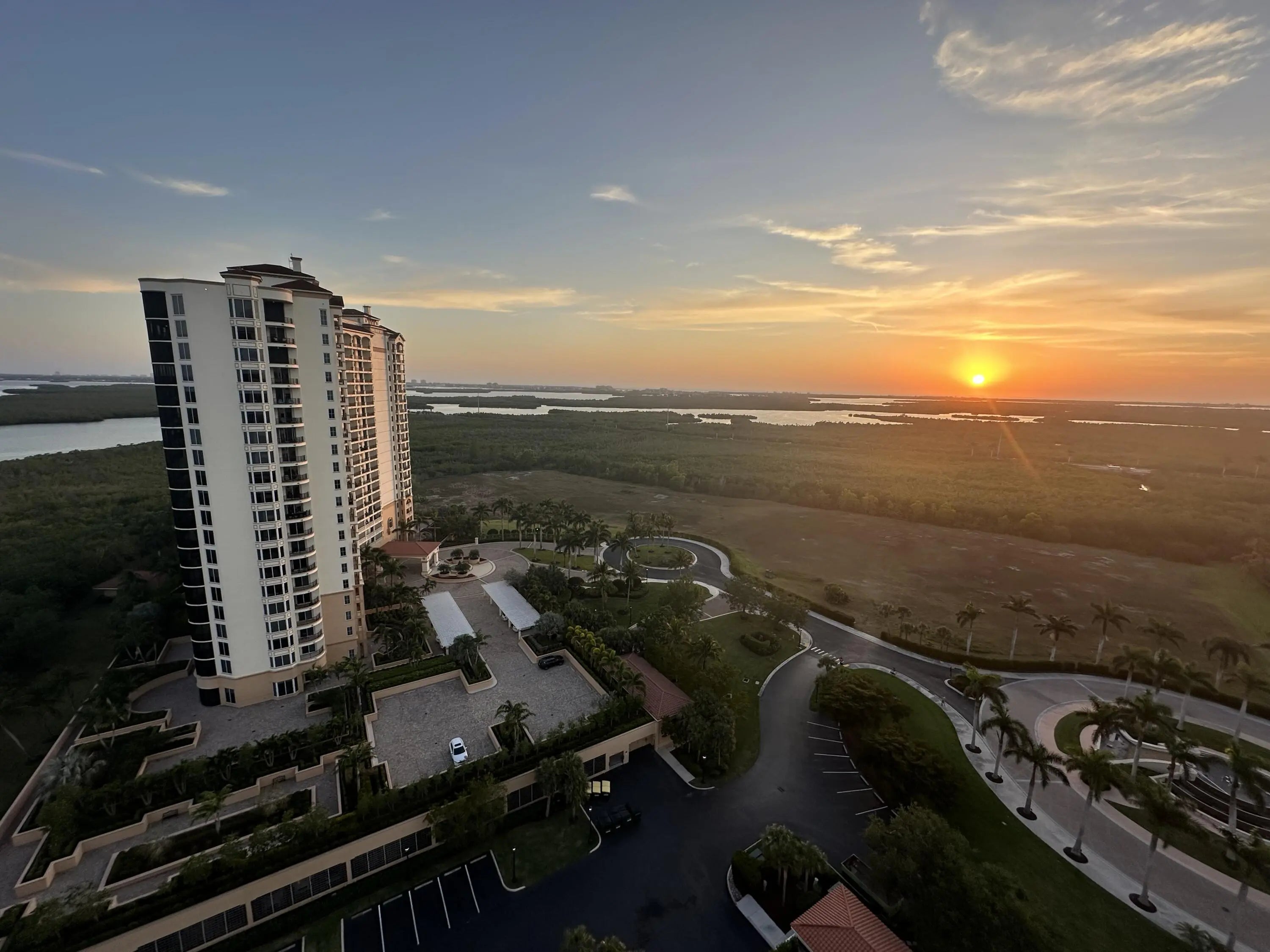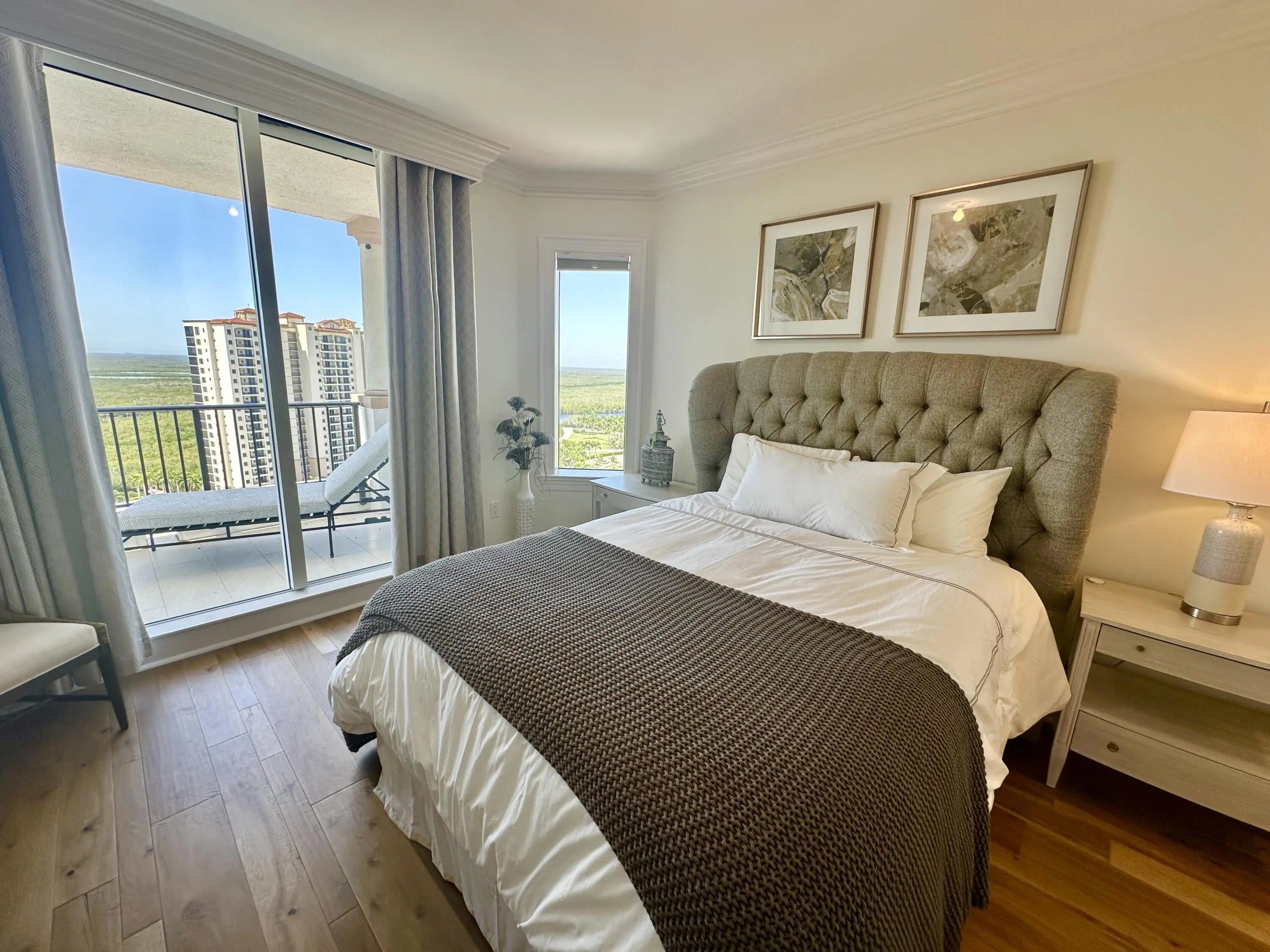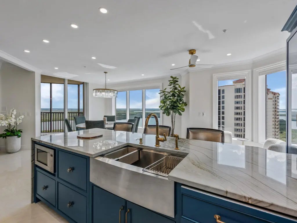 Welcome to the Aversana of Hammock Bay Golf & Country Club where exquisite luxury living meets jaw dropping views. This is high rise condo living on a whole new level...literally! This updated 2,800 SF residence perfectly blends elegance, comfort and style & comes completely Turn-Key ready for you to move right in. Complete with everything you see, every inch of this home has been carefully curated to offer a living experience that exceeds expectations, with the finest materials like marble & hard wood floors, an open and airy layout & panoramic views of the 10,000 Islands that will take your breath away from every room. The grand entrance to the unit via your private elevator set the tone for the sophisticated retreat within. This spacious corner unit has 3-bedrooms, 3.5-bathrooms & an office with never-ending views that are surely to distract your work load! The private owner's suite is located on the east side of the residence with it's own hallway, ample storage b/n the walk-in and 2 other closets & has its own patio entry just off the living room. The bathroom has dual quartzite vanities, crystal cabinet pulls, a soaking tub, shower & a water closet with pocket door. The kitchen & main living areas were redesigned & opened up to allow for more free flowing entertaining spaces & truly captivate the essence of the outdoor views from the second you step inside. It comes equipped with high-end appliances, floating shelves and a porcelain backsplash providing true function & modern design elements. The waterfall edge on the rare Quartzite kitchen counters make a bold statement to complete the look, all while adding timeless beauty. The living and dining areas seamlessly blend together and the custom built-in's glass shelves provide a gorgeously framed backdrop for your TV. Just around the corner from the kitchen & off the living room, a mini bar cabinet was added to provide the perfect cocktail prep area for your sunset cocktails on the veranda. The 2 guest ensuites do not disappoint in any way - each are very spacious with updated bathroom vanities, plenty of closet storage & yes, incredible views abound here too! They are on the other side of the unit and each has privacy from the other, all while offering the same stunning panoramic backdrops this tower is known for. These 2 bedrooms share a veranda & your guests will enjoy impressive views out to the Gulf of Mexico, Isles of Capri, Marco Island & all the way to Naples. This residence doesn't stop at its extraordinary interior; the Aversana Condominium offers exceptional resort-style amenities designed to enhance your lifestyle. The pool is perfect for sunning and swimming, the new outdoor tiki bar & barbecue areas are designed for entertaining guests or simply enjoy a meal with family and friends in this beautifully appointed outdoor space. Whether you're enjoying sunsets over the bay or relaxing by the pool, this unit provides the ultimate experience in SWFL luxury living.