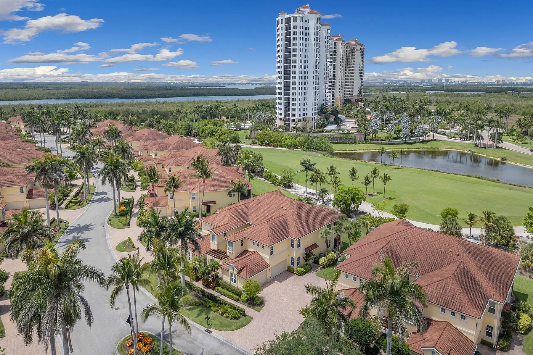 Experience the ease of luxury living in this beautifully furnished first-floor coach home, nestled within the sought-after Rialto enclave of the prestigious gated Hammock Bay Golf & Country Club. Combining the spacious feel of a single-family home with the low-maintenance convenience of condominium ownership, this residence features three bedrooms, two baths, and a two-car garage—perfect for seasonal or year-round living. Enjoy desirable western exposure from your expansive screened lanai with no-see-um screening, offering peaceful golf course views and a seamless extension of your indoor living space. Impact-resistant doors and windows provide enhanced security and year-round peace of mind. Inside, you'll find abundant natural light and brand-NEW tile flooring throughout the main living areas, elevating the home's elegance and style. The open-concept kitchen is appointed with white cabinetry, under-cabinet lighting, recessed ceiling lights, a pantry, and a full suite of appliances including a refrigerator with icemaker, range, microwave, and NEW dishwasher (2022). A charming breakfast nook framed by a large window provides lanai access, while the formal dining room features custom wall mirrors that visually expand the space. The light-filled living room flows effortlessly to the outdoor lanai through glass sliders-ideal for both relaxed lounging and entertaining guests. The spacious primary suite offers direct lanai access, a generous walk-in closet, and an en-suite bath with dual vanities, full-width mirrors, walk-in shower with bench, and a linen closet. Two guest bedrooms enjoy their own private wing and share a well-appointed bathroom with a shower/tub combination. A functional laundry room includes a washer and dryer, utility sink, and overhead storage cabinets. A NEW hot water heater (2023) adds further value and peace of mind. This exceptional residence is located within a highly-sought-after community offering resort-style living just minutes from the executive airport, award-winning, white-sand beaches, renowned golf courses, fine dining, casual waterfront restaurants, boutique shopping, grocery stores, parks, art galleries, marinas and yacht clubs, and all the popular cultural and recreational offerings of Naples and Marco Island.