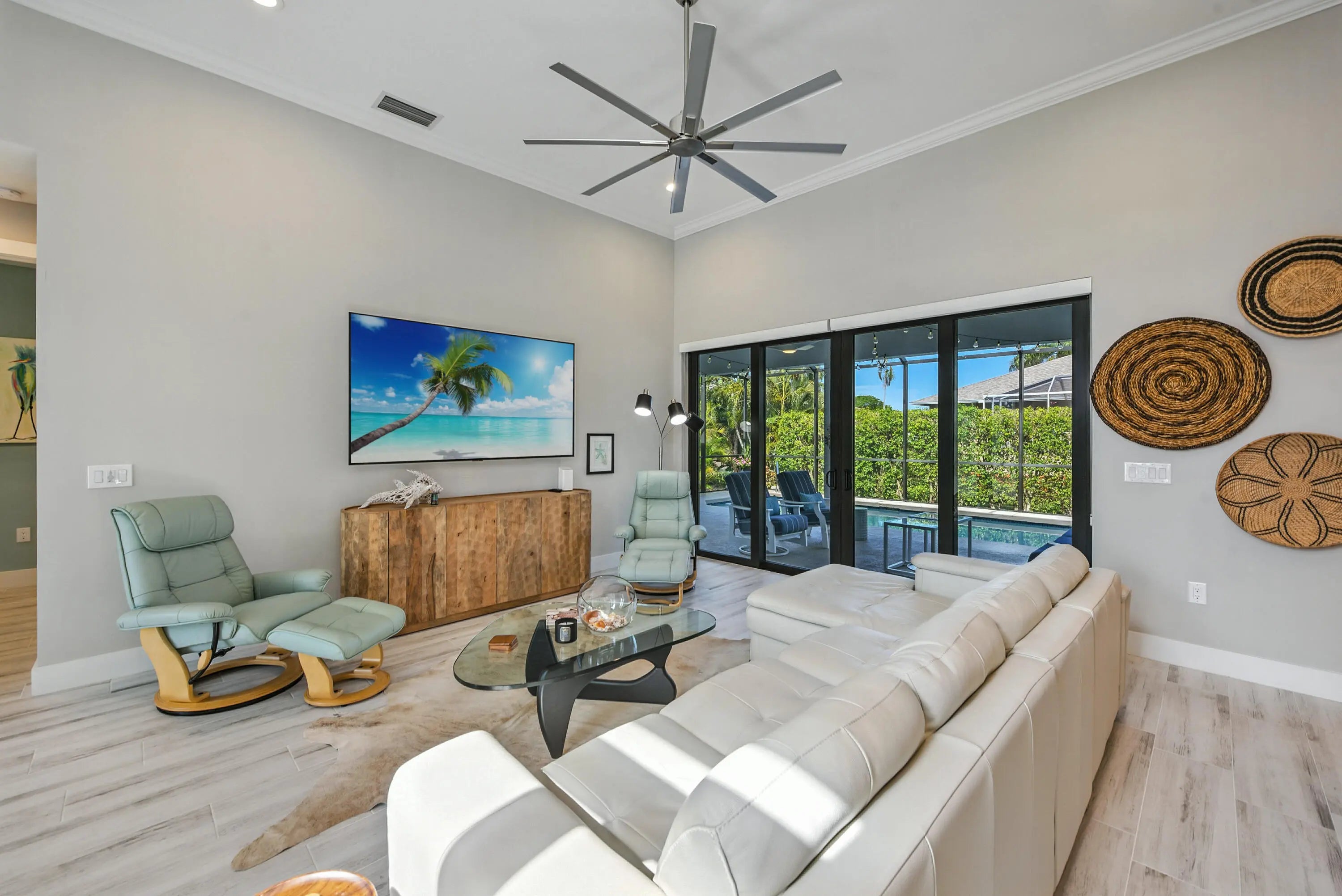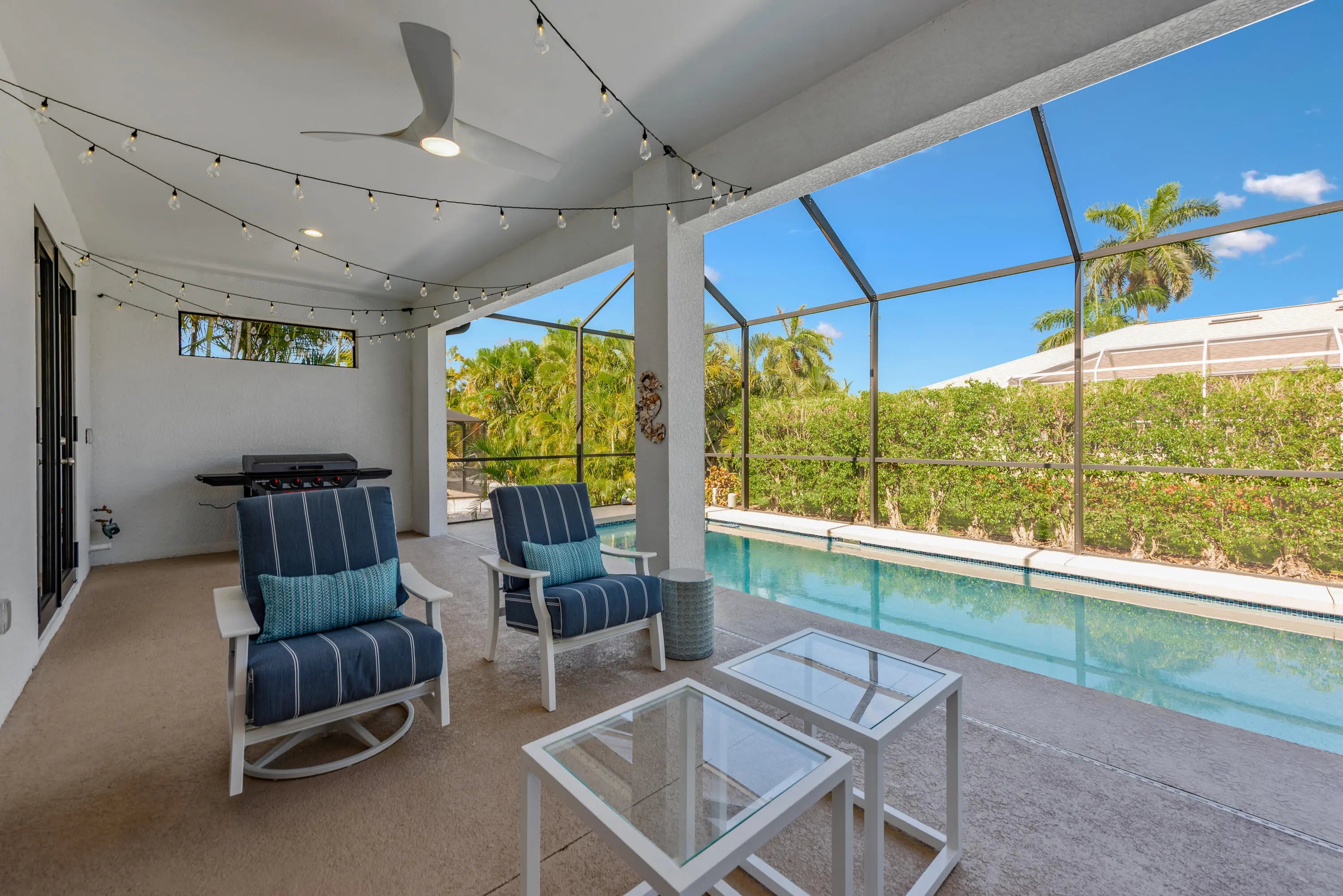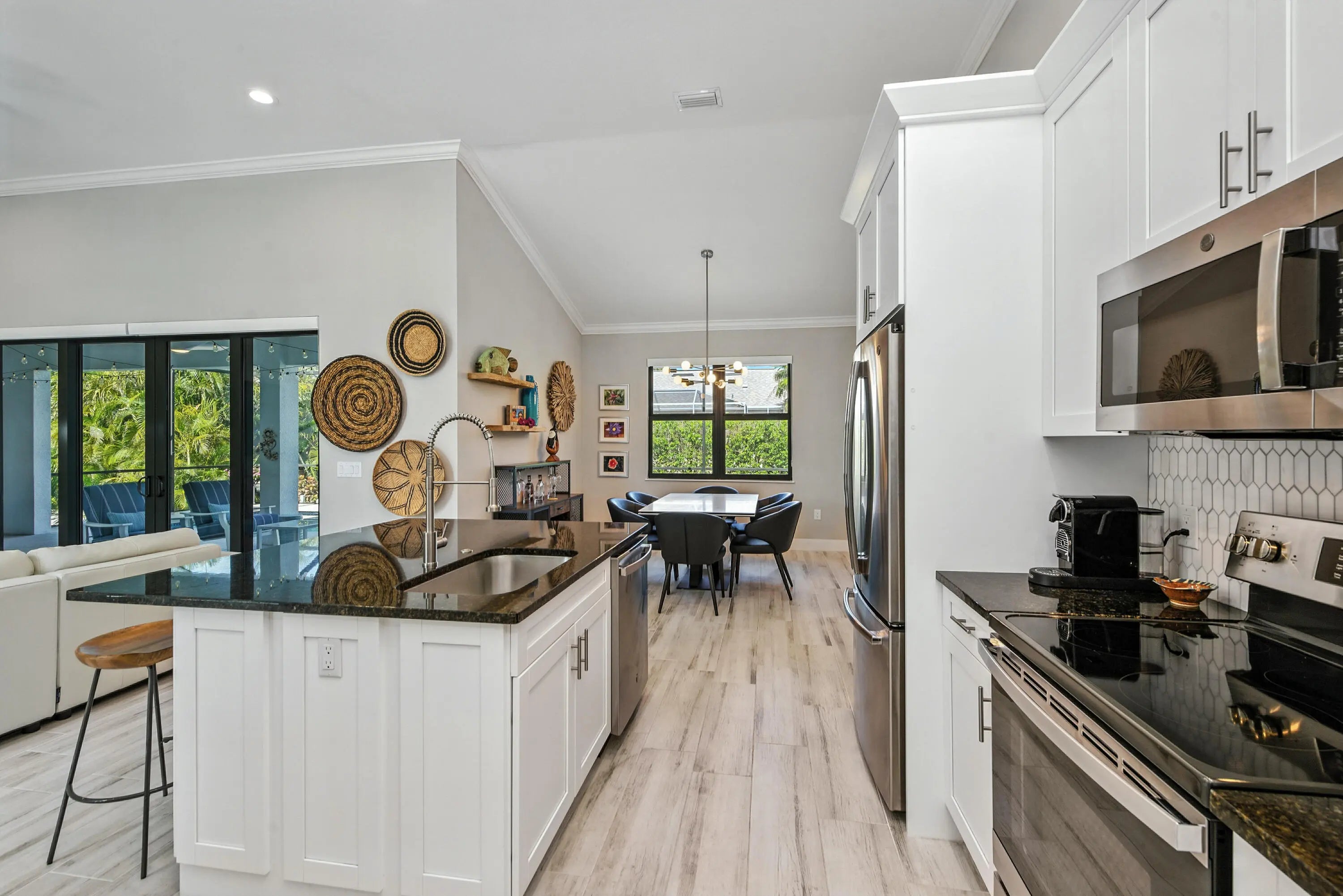 This property on Marco Island is the epitome of island living. Constructed in 2021, it features 3 bedrooms, 2 bathrooms an open floor with western exposure, and impact resistant doors and windows throughout. The sleek and modern entryway leads with high ceilings, crown molding, window treatments, modern light fixtures, and tile flooring throughout. The primary bedroom suite boasts a tray ceiling, custom closet systems, and a built-in wood grain desk. The en-suite bath includes a large walk-in tile shower with a custom niche, dual sinks, extra storage and large mirrors. The guest bedrooms offer a quiet retreat, and shared full bathroom showcases statement wallpaper and modern tile shower. The kitchen offers shaker-style white cabinetry, granite countertops, extra storage in front of the island, stainless sink with disposal, stainless steel appliances, and easy access the dining area and spacious laundry room with storage tower. The outdoor space includes a sparkling pool with an integrated spa, large, covered lanai space, screen enclosure and a convenient circular driveway, updated landscaping with espalier detail, and a two-car attached garage with epoxy-painted flooring. Centrally located nearby to Mackle Park with walking paths, playground, recreation center and within a mile of world-class shopping, fine dining and white sandy beaches.