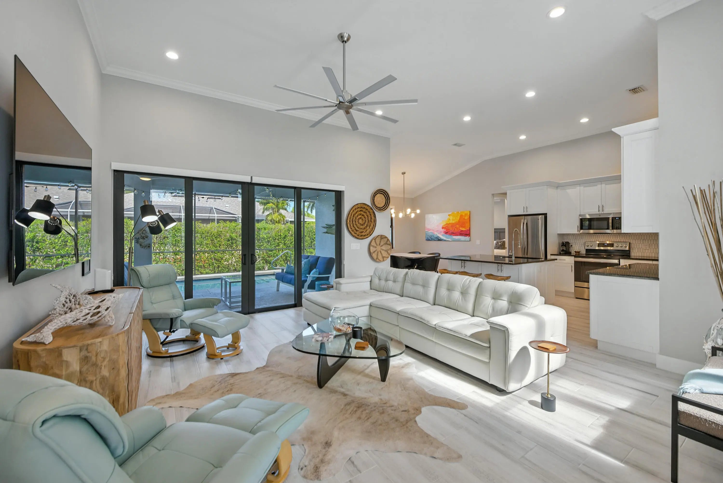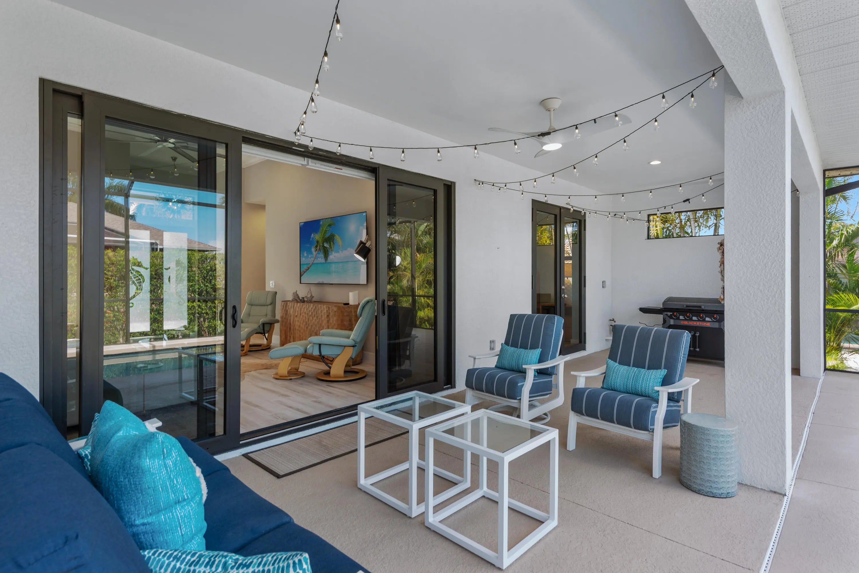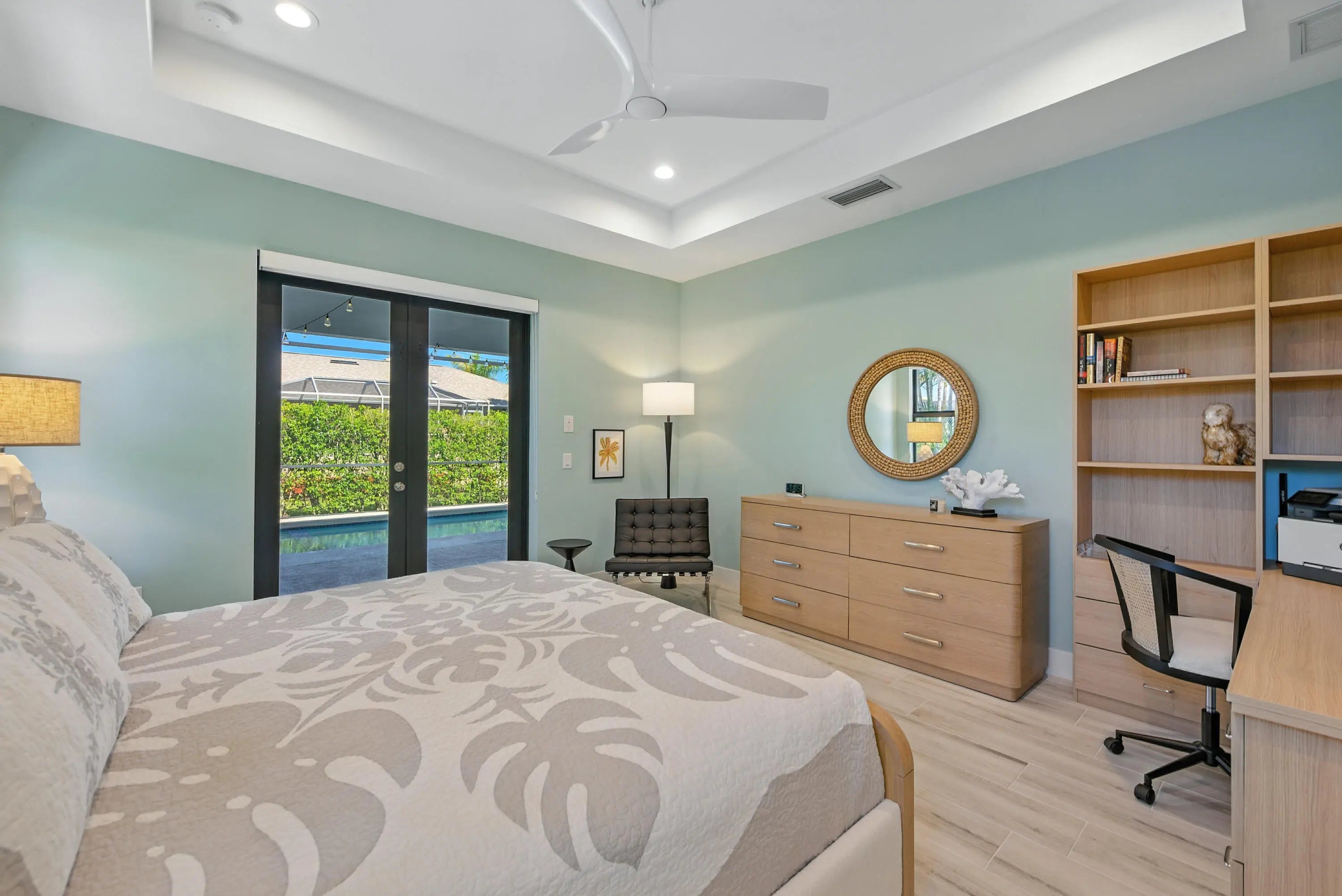 This property on Marco Island is the epitome of island living. Constructed in 2021, it features 3 bedrooms, 2 bathrooms an open floor with western exposure, and impact resistant doors and windows throughout. The sleek and modern entryway leads with high ceilings, crown molding, window treatments, modern light fixtures, and tile flooring throughout. The primary bedroom suite boasts a tray ceiling, custom closet systems, and a built-in wood grain desk. The en-suite bath includes a large walk-in tile shower with a custom niche, dual sinks, extra storage and large mirrors. The guest bedrooms offer a quiet retreat, and shared full bathroom showcases statement wallpaper and modern tile shower. The kitchen offers shaker-style white cabinetry, granite countertops, extra storage in front of the island, stainless sink with disposal, stainless steel appliances, and easy access the dining area and spacious laundry room with storage tower. The outdoor space includes a sparkling pool with an integrated spa, large, covered lanai space, screen enclosure and a convenient circular driveway, updated landscaping with espalier detail, and a two-car attached garage with epoxy-painted flooring. Centrally located nearby to Mackle Park with walking paths, playground, recreation center and within a mile of world-class shopping, fine dining and white sandy beaches.