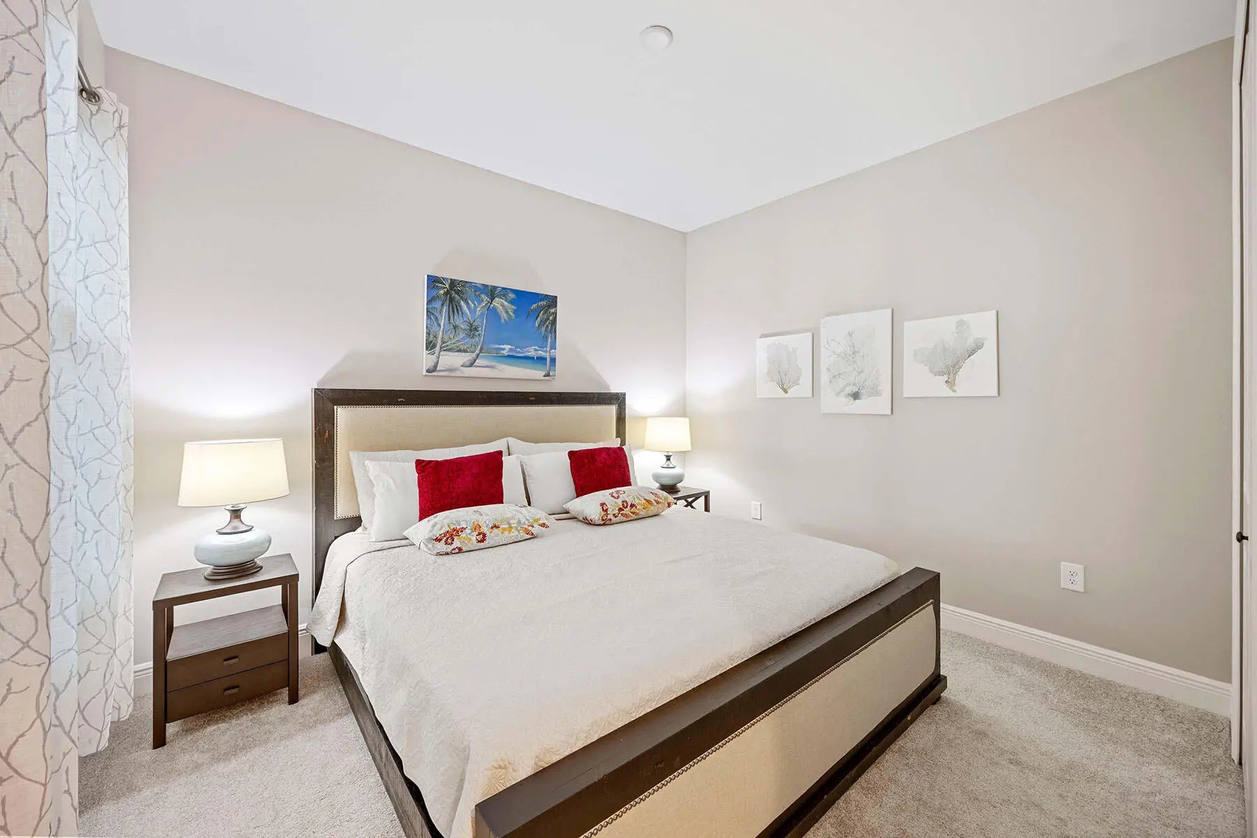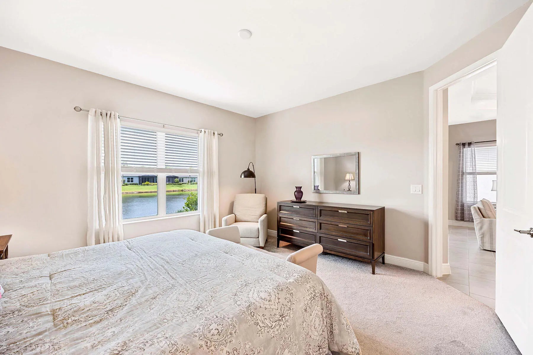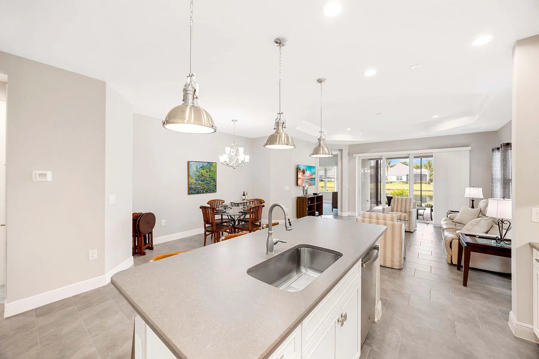 Experience Coastal Luxury at Its Finest in Marquesa Isles. The essence of refined living in this exceptional two-bedroom plus den residence, blending timeless design with modern upgrades, this home offers an unmatched lifestyle. As you step into the welcoming foyer, you're immediately embraced by an atmosphere of sophistication, featuring 9-foot ceilings, 8-foot doors, and elegant 24'' x 12'' ceramic tile flooring throughout the main living areas. A set of glass French doors opens to a spacious 11' x 12' den, offering the ideal space for a home office, reading room, or guest retreat. The open-concept kitchen is a true centerpiece, thoughtfully designed with an oversized quartz island, G.E. stainless steel appliances, and a designer tile backsplash that adds both function and flair. 42-inch cabinetry adorned with crown molding and under-cabinet lighting provide both elegance and practicality, making this kitchen a dream for any culinary enthusiast. Flowing effortlessly into the 16' x 17' great room, the living space is highlighted by a coffered ceiling with crown molding and expansive southern exposure lake views that bring the outdoors in with natural light and a tranquil ambiance. It's the perfect setting for both entertaining and relaxing. The primary bedroom suite is a luxurious retreat, beautifully appointed with Belle Meade designer furniture, including a dresser and matching end table. It also features a large walk-in closet, a second additional closet, and a well-appointed en-suite bath with dual sinks and an oversized, designer-tiled shower, all crafted with premium finishes for a spa-like feel. Step outside to a 14' x 10' screened lanai with 10 ft extension, complete with a sunshade and southern exposure, offering the perfect place to enjoy your morning coffee or unwind at sunset with serene lake views. Additional thoughtful features include Impact pocket sliding doors with unobstructed lake views, plush carpeting in the bedrooms, custom blinds and curtains throughout. Smart Hub connects to Z-wave devices to the front door lock, thermostat, doorbell camera and garage door opener along with Hotwire fiber-optic service for high-speed TV and internet. The 18' x 20' garage has been upgraded with a durable epoxy floor, R-31 insulated garage door and attic insulation, enhancing comfort and energy efficiency year-round. Residents of Marquesa Isles enjoy access to exclusive amenities including a Clubhouse, resort-style pool and hot tub, dog park, and beautifully maintained grounds—all within a private, gated community that epitomizes coastal luxury and carefree living. Just minutes from Naples' best shopping, golf courses, and world-renowned beaches.