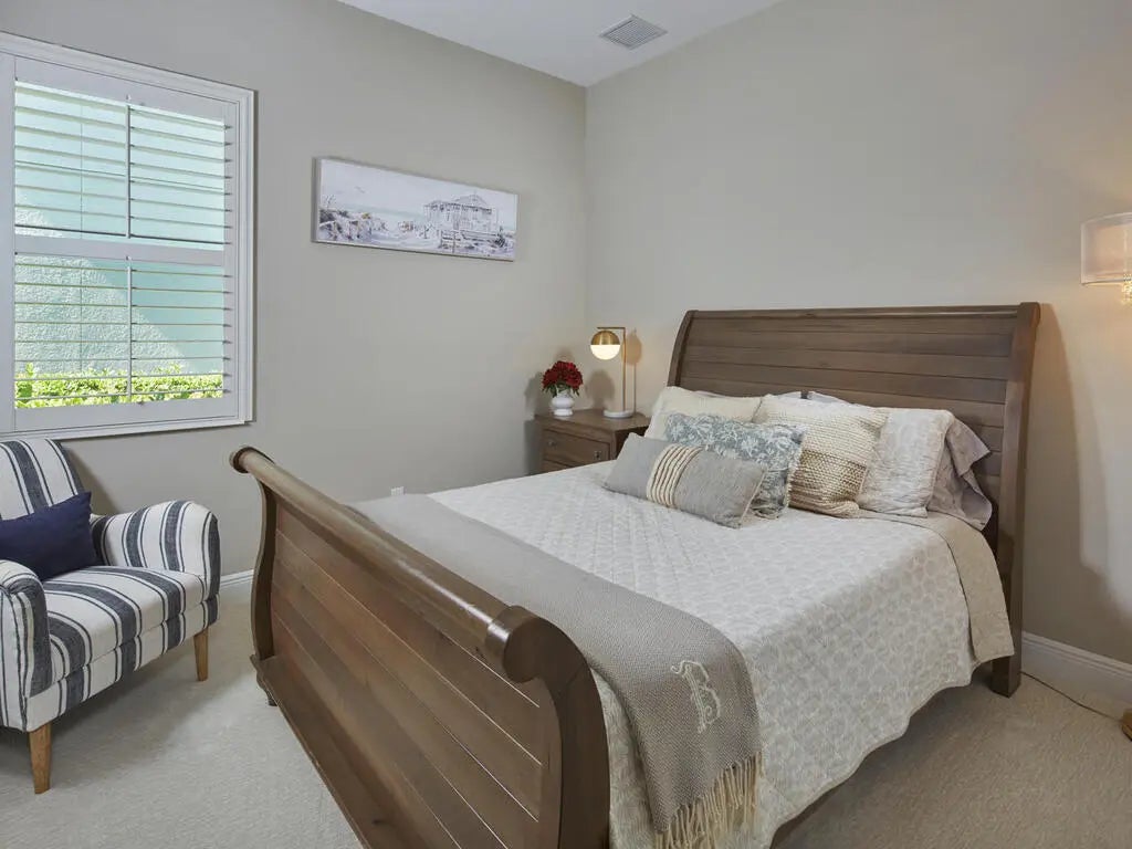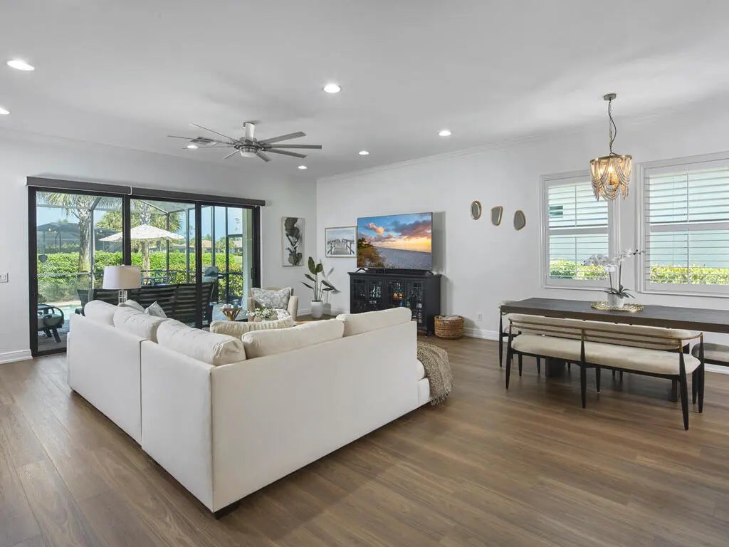 Exceptional 3 bedroom plus den, 2 and a half bath home located within gated Raffia Preserve! Built by WCI, this Heron Model home features luxurious finishes throughout, a desirable open floor plan, and ample natural light. Recent upgrades to this meticulously maintained home include plantation shutters, custom electric shades in the living room, luxury vinyl flooring in the main living space, new carpet in the bedrooms, new pendant light fixtures, and more. The gorgeous kitchen features beautiful white cabinetry, large center island, granite counters, and stainless-steel appliances. The master suite is a private retreat with spa-like ensuite bath offering dual vanities and stunning walk-in shower. The additional 2 guest bedrooms and den provide ample space for friends and family. The interior flows seamlessly out to the large, screened lanai boasting large pool, newly sealed patio pavers, updated surrounding landscaping, and lake views. This is the perfect place to relax and unwind while enjoying the beautiful Florida sunshine poolside. The gated community of Raffia Preserve offers many fine amenities including clubhouse with fitness center, resort-style pool, basketball courts, playgrounds, walking trails, and more. Enjoy a prime location near all Naples has to offer.