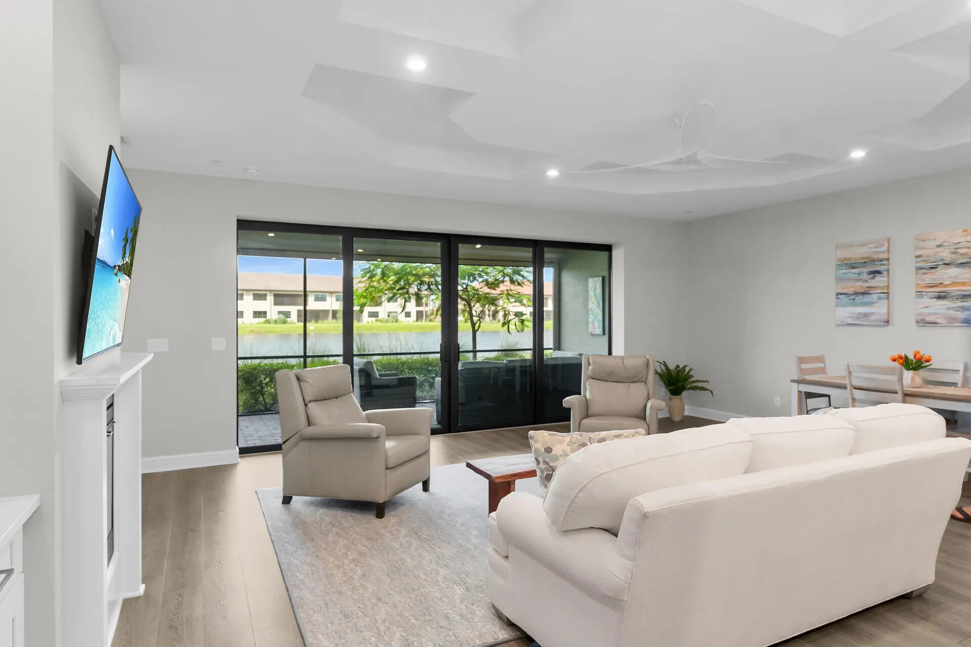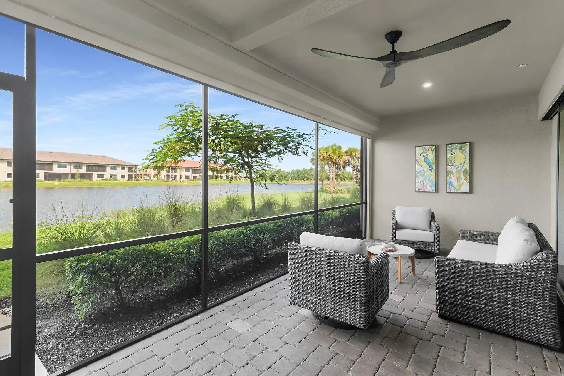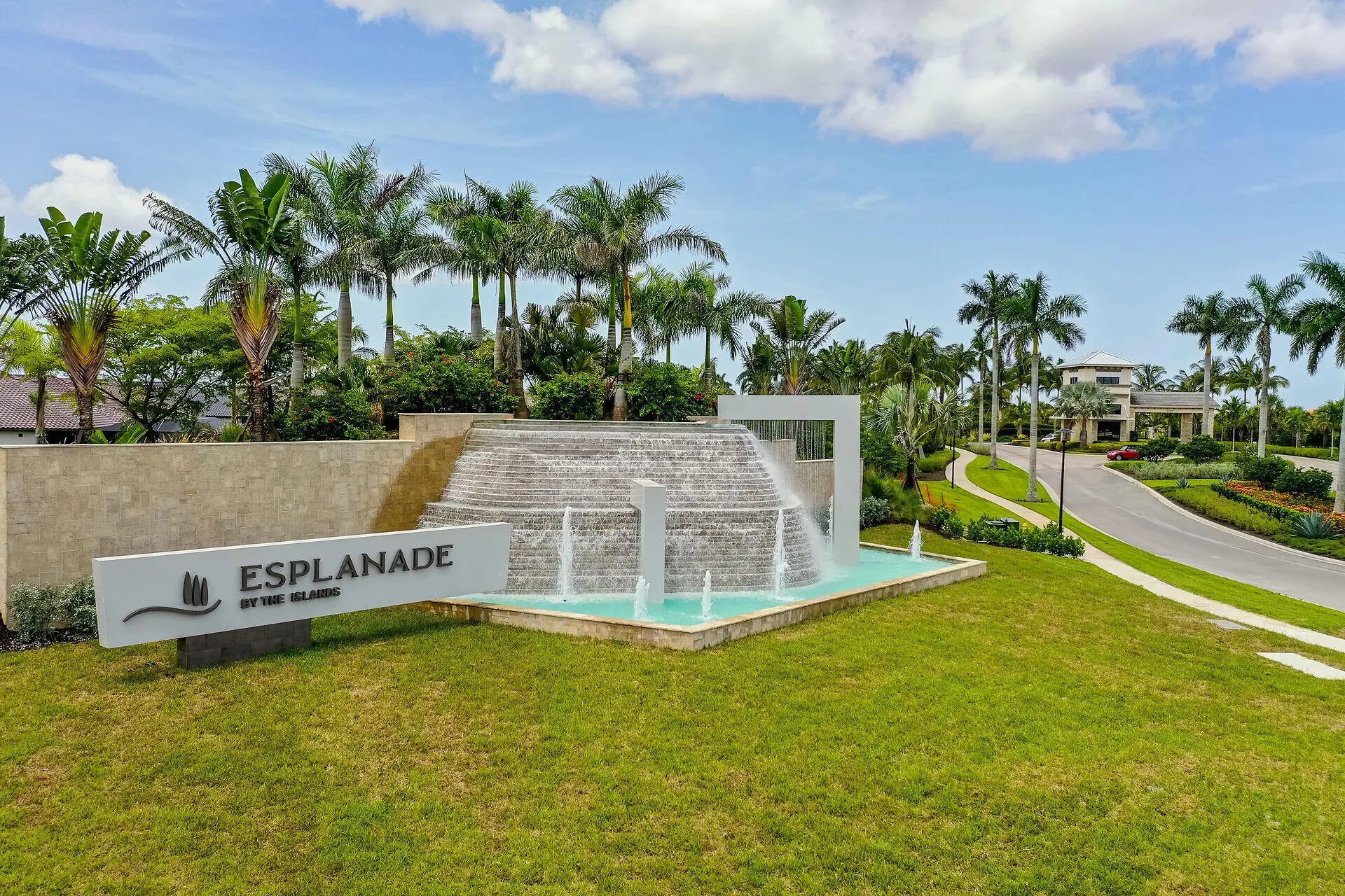 Welcome to this elegant 2-bedroom 2-bathroom, 1 car garage first floor coach home. Built in 2022 and located in the desired gated community of Esplanade By The Islands. Walk in to this big open floor plan with beautiful custom tray ceilings and custom fans. A designer kitchen with ss appliances, quartz countertops, upgraded lighting, soft close drawers and more. Hurricane impact windows and doors throughout for maximum protection along with custom electric hurricane screen. In unit electric fire place for nice ambiance with specialty built in niches. Spacious master bathroom with expansive shower, dual vanities and oversized walk in master closet. Expansive lanai overlooking the tropical wildlife and serene lake with a SW exposure to get plenty of sun and watch sunsets as well as no road noise on this quiet side of the street and close proximity to the pool. Esplanade By The Islands is known for its superb amenities, catered to a luxurious and active lifestyle. This guard gated community offers a state-of-the-art fitness center, with cardio, strength training machines, free weight area, movement studio, and locker rooms. A full-service Spa at Esplanade with massage and body treatments, and a resort-style pool with towel service, and a Bahama Bar & Grill. Residents can also enjoy various sporting activities like tennis, pickleball, and bocce ball courts, a dedicated dog park, and a lifestyle manager to assist with community life and organize events.
