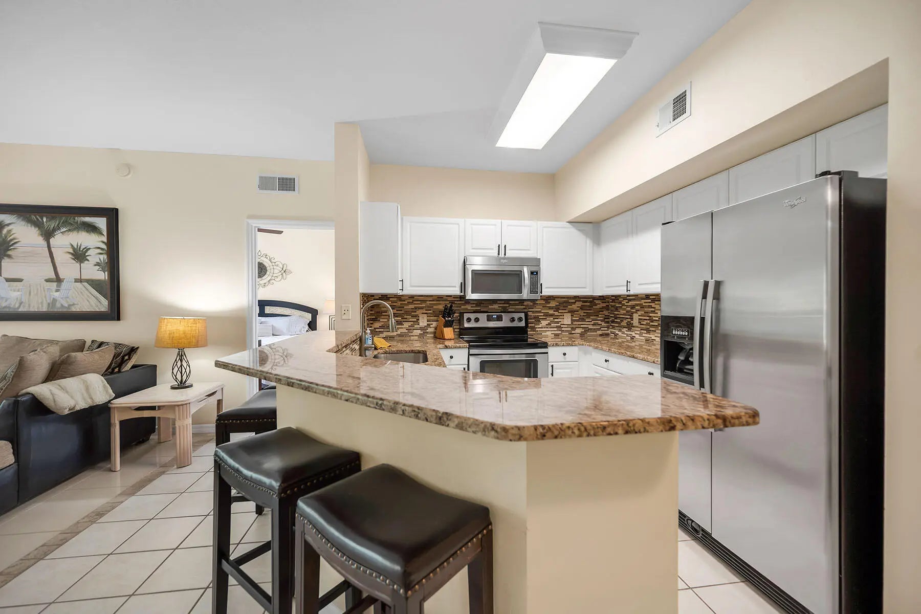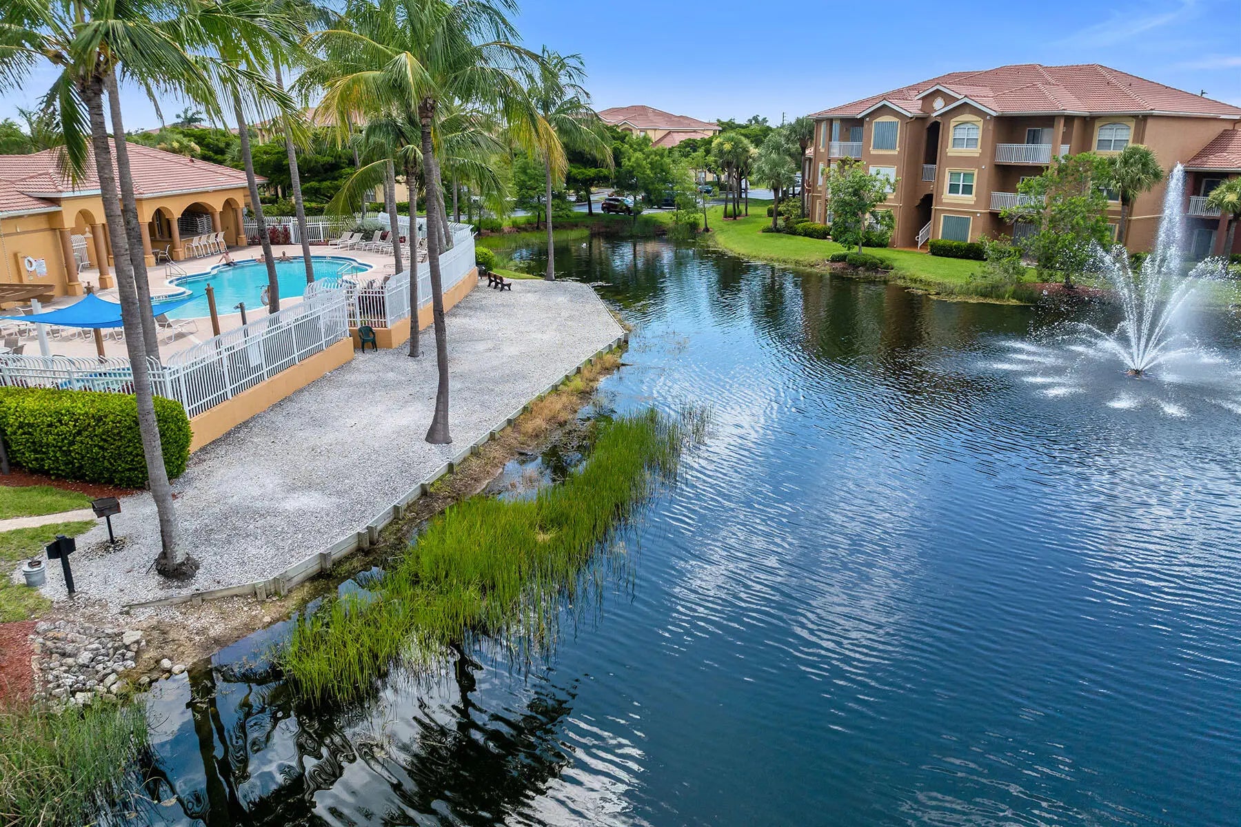 Enjoy peaceful lake views, sunny southern exposure, and complete privacy from this turnkey second-floor condo in the gated Gardens at Beachwalk community. This beautifully maintained 2-bedroom, 2-bath residence features tile flooring throughout the main living areas, with upgraded porcelain tile in the living room for added elegance. The glass sliders open to a spacious lanai overlooking the water, where you can relax and enjoy views of the lake. The kitchen is both stylish and functional, showcasing white shaker-style cabinets, granite countertops, a mosaic tile backsplash, and a breakfast bar for casual dining. Whirlpool stainless steel appliances, including a range, microwave, refrigerator/freezer, and dishwasher, complete the space. An adjacent dining area with a ceiling fan offers a bright and welcoming setting for meals. The owner's suite offers tranquil water views, a mirrored walk-in closet with custom shelving, a second closet for extra storage, and an en-suite bath featuring a granite vanity and a shower/tub combination. The guest bedroom also includes a mirrored walk-in closet with shelving and direct access to a full bath with a granite vanity and tub/shower combo, which is also accessible from the hallway for guests. Additional features include a GE washer and dryer and a 2021 A/C system. Offered turnkey furnished, this move-in-ready condo is ideal as a seasonal getaway, investment property, or full-time residence and has been a very active rental with strong performance. Gardens at Beachwalk provides a resort-style lifestyle with amenities including a large heated pool, spa, beach-themed sundeck, fitness center, clubhouse, and game room—all set in a beautifully landscaped, park-like setting. Located in the desirable Iona district of South Fort Myers, you're just minutes from Fort Myers Beach, Sanibel Island, and the shops, restaurants, and entertainment of Times Square and Margaritaville. With recent community improvements like new roofs, this lakefront condo offers an unbeatable combination of comfort, convenience, and Florida charm.
