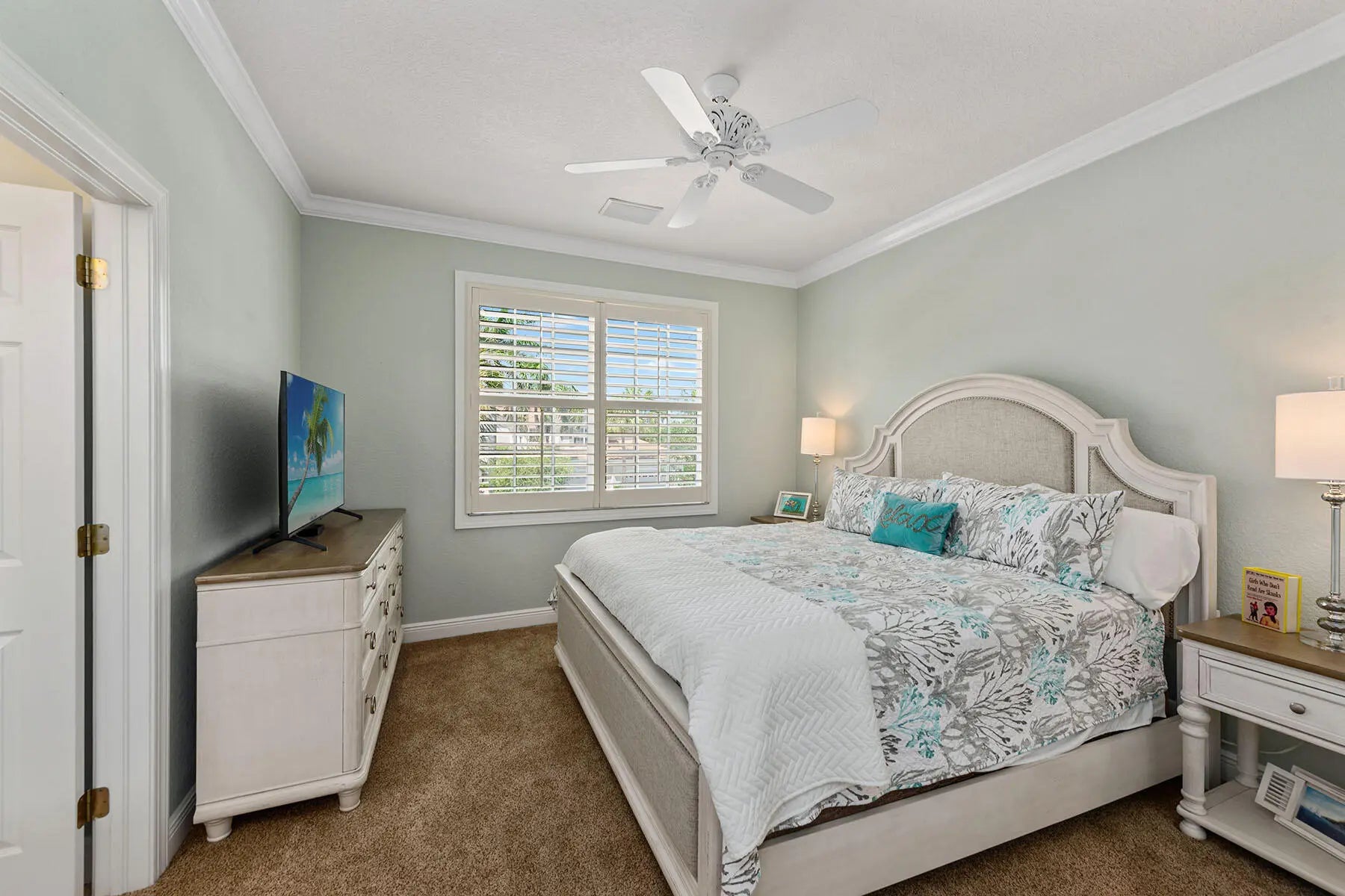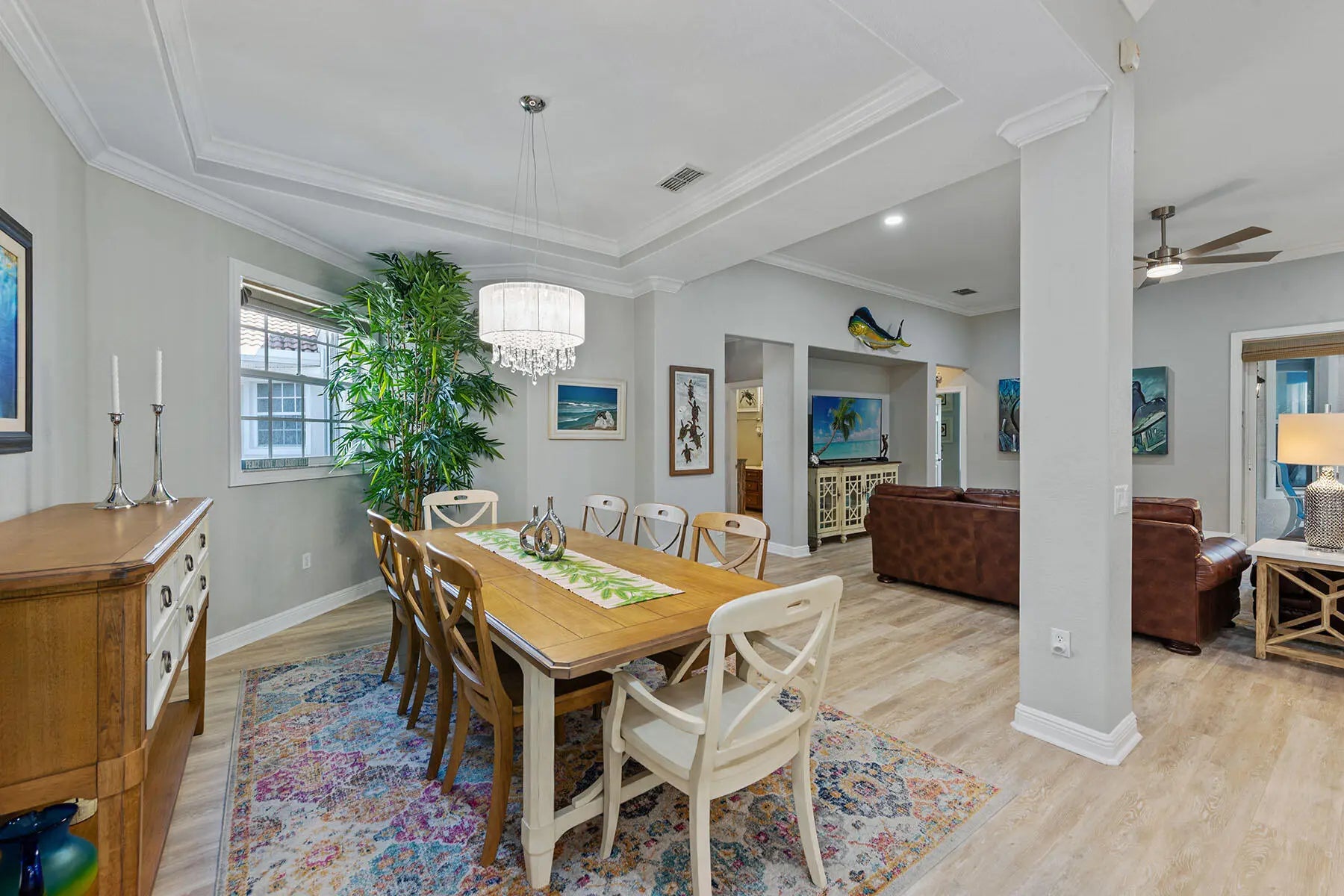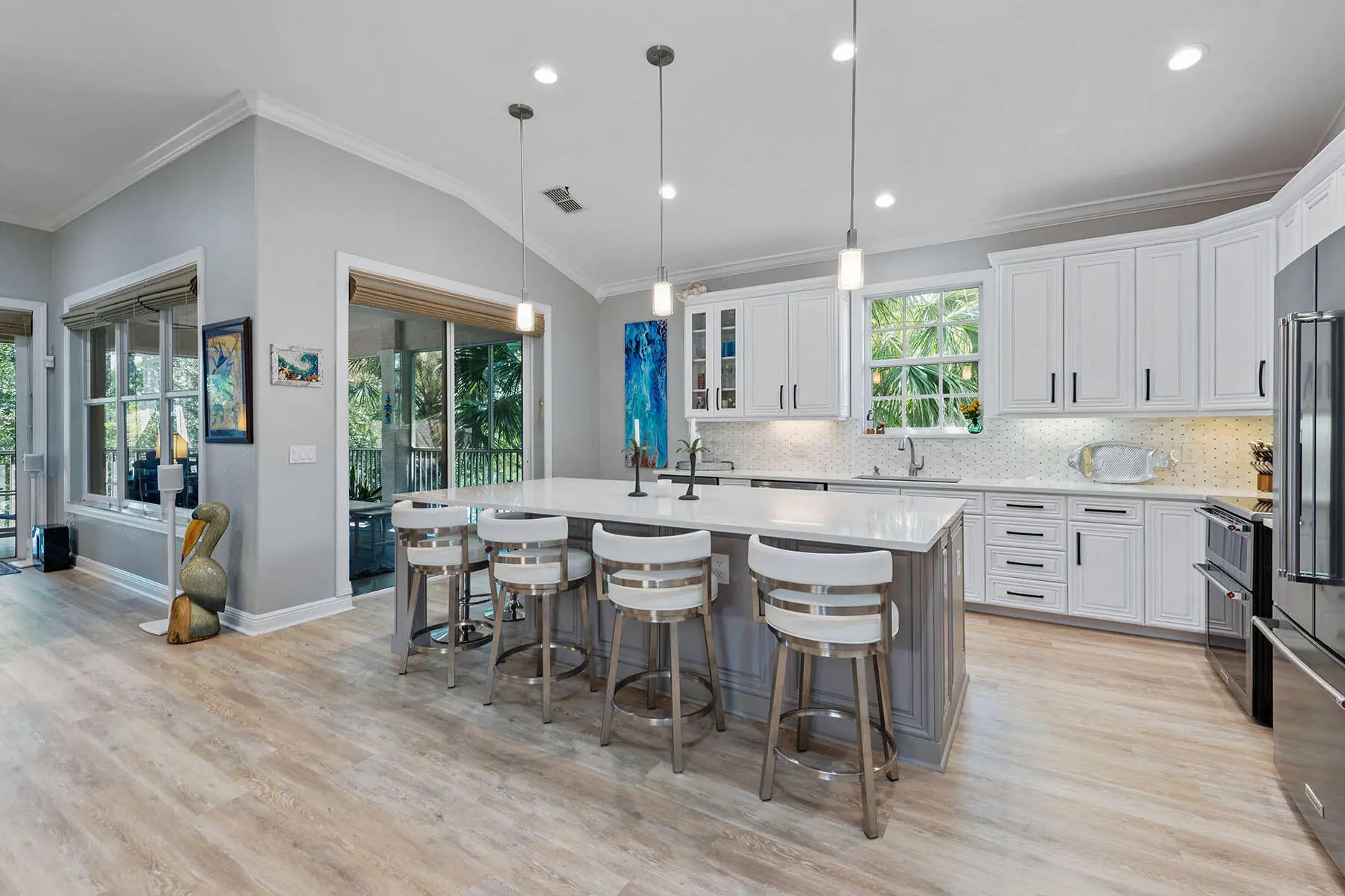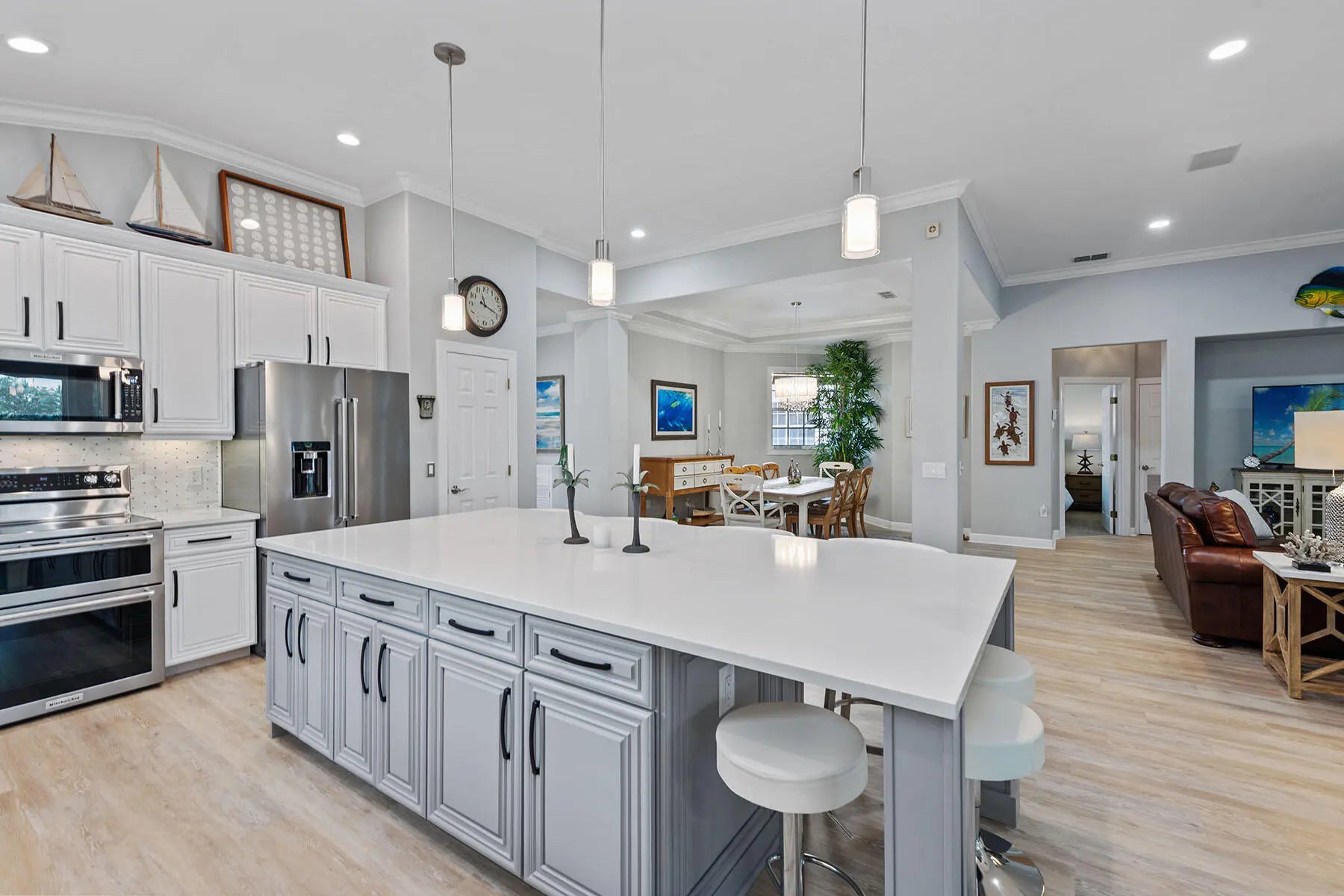 Experience a refined coastal retreat with immediate GOLF membership in the popular Juliana Village at the highly sought-after Naples Lakes Country Club. This spacious Key West floor plan coach home offers 3 bedrooms plus a den, 3 full baths, and an attached 2-car garage, all complemented by tranquil lake and golf course views. With eastern exposure, a screened lanai, and a serene backdrop of lush tropical landscaping, this furnished residence invites seamless indoor-outdoor living. The covered lanai features tile flooring, a ceiling fan, and a peaceful vantage point over the 12th hole, perfect for enjoying morning coffee or evening sunsets. Inside, the open-concept layout showcases new LVP wood-look flooring in the main living areas, crown molding, and LED recessed lighting. The updated gourmet open kitchen is a showpiece with gorgeous white cabinetry, under-cabinet lighting, quartz countertops, beautiful tile backsplash, large island with bar seating, pendant lighting, and a window above the sink. Premium KitchenAid stainless steel appliances include a French door refrigerator/freezer, double oven range, microwave, dishwasher, and wine cooler. The formal dining area features a tray ceiling and stunning chandelier, while the living room offers a modern ceiling fan and sliding glass doors that open directly to the lanai. The owner's suite is a serene escape with private lake views, lanai access, a spacious walk-in closet with built-ins, and a spa-like bath boasting dual white quartz vanities with full-width mirror, a glass-enclosed walk-in shower, separate soaking tub, and plantation-shuttered window with palm views. Two guest bedrooms each feature plantation shutters and ceiling fans—one with an en-suite bath, the other adjacent to a full bath with a shower-tub combo. A den with double-door entry makes the perfect home office or study. The laundry room is complete with a GE Profile washer and dryer, utility sink, and overhead storage. As a resident of Naples Lakes Country Club, one of the most popular bundled gated golf communities in the area, you'll enjoy an Arnold Palmer-designed championship golf course, resort-style pool and spa, Har-Tru tennis courts, pickleball, bocce, fitness center, clubhouse dining, a full activity and event calendar, and Juliana Village's own neighborhood pool and spa. Ideally located just minutes from Fifth Avenue and Third Street in downtown Naples, shopping, dining, art galleries, parks, executive airport, pristine beaches and all popular Southwest Florida attractions, this home offers the best of luxury living with golf, recreation and relaxation at your doorstep.