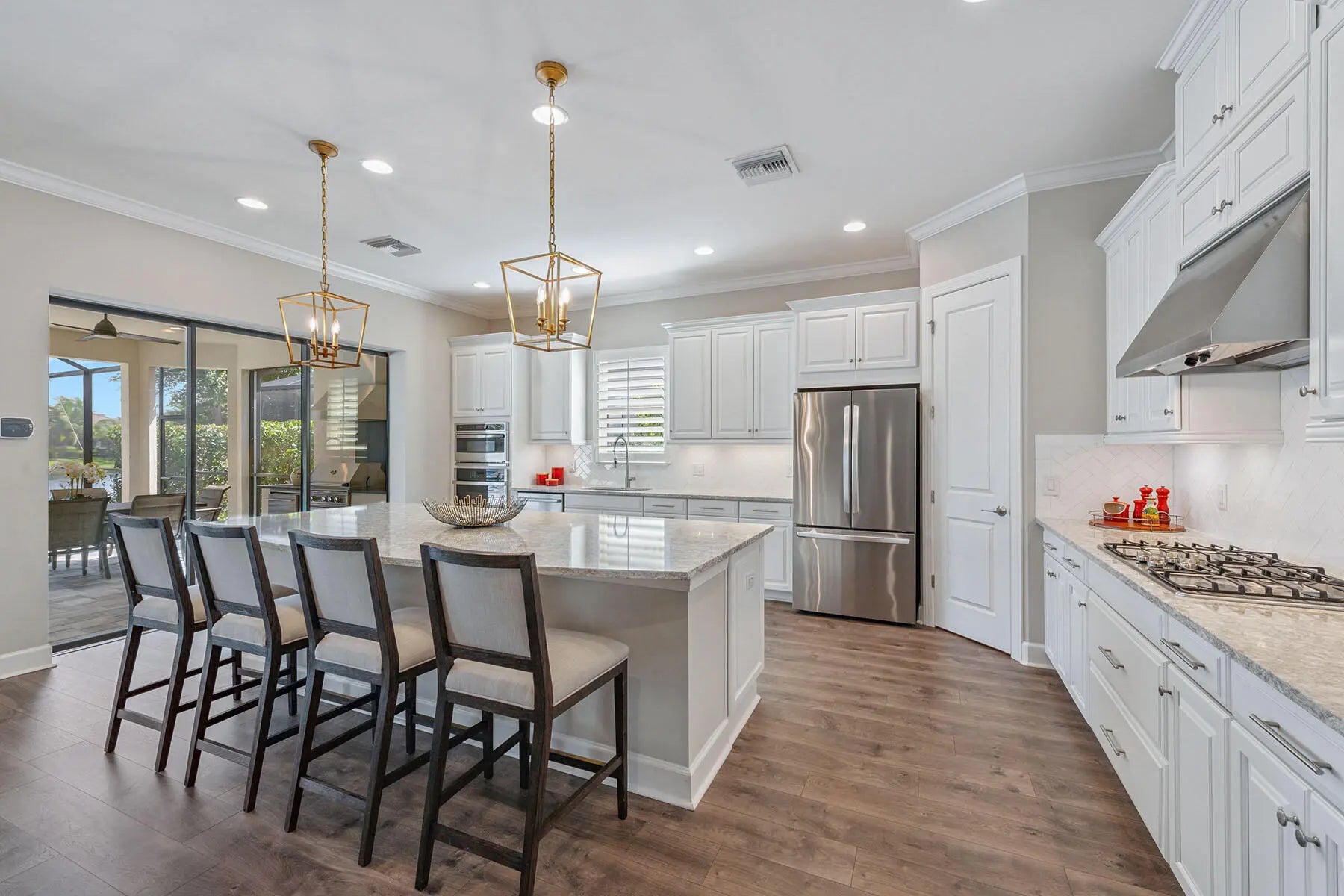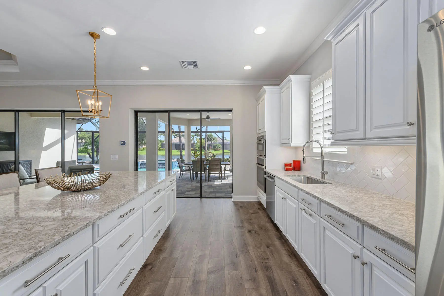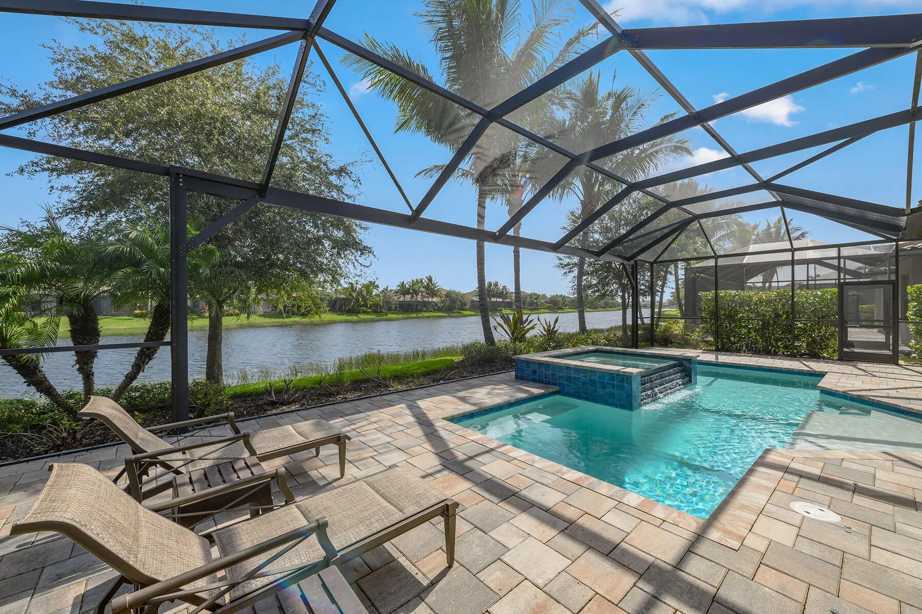 Enjoy peaceful lake views and a refined indoor-outdoor lifestyle in this popular Pallazio model, a stunning four-bedroom plus den, three-bath home built in 2019 in Oyster Harbor at Fiddler's Creek. Designed with a desirable open-concept layout and split-bedroom plan, the residence features a heated saltwater pool and spa with waterfall spillover, powered by a new Pentair gas heater. The picture-frame screen enclosure frames the tranquil waterfront, while the fully equipped summer kitchen includes a Somerset stainless steel grill with rotisserie, leathered granite countertops, and a 24-inch double drawer beverage refrigerator. Ideal for year-round enjoyment, the lanai also offers recessed lighting, ceiling fans, and in-ceiling speakers. Impact-resistant glass and manual shutters provide added peace of mind. Inside, a glass French door entry opens to a welcoming foyer with a tray ceiling, setting the tone for the elegant interior. Wood-look luxury vinyl plank flooring, crown molding, recessed lighting, and thoughtful upgrades carry throughout. The gourmet kitchen is a showpiece with white cabinetry, quartz countertops, an island with pendant lighting, tile backsplash, and under-cabinet lighting. Premium GE stainless appliances include a 36' five-burner gas cooktop and hood, Advantium microwave, wall oven, new Bosch dishwasher, new French door refrigerator/ freezer, and a pantry for added storage. The adjacent formal dining area features an elegant chandelier and flows seamlessly into the open-concept living room, creating a perfect space for entertaining. The living area is equally inviting with a recessed ceiling, accent wall, and a dry bar with floating shelves and a Monogram glass-front beverage fridge, all overlooking the lanai through sliding glass doors. The owner's suite is a private retreat overlooking the lake, with a tray ceiling, white plantation shutters, and a luxurious en-suite bath. Highlights include a quartz dual-sink vanity with makeup counter, sconce lighting, a large glass-enclosed walk-in shower with multiple shower heads, a window for natural light, and a spacious walk-in closet with custom built-ins. The guest area includes three bedrooms, each with plantation shutters and wood slat closet shelving. Two guest rooms share a full bath with a tub/shower combination, while the third offers an en-suite with a walk-in shower and glass enclosure. A flexible den with ceiling fan makes the perfect home office or study. The laundry room includes GE front-load washer and gas dryer on pedestals, a utility sink, cabinetry, and counter space. The two-car garage features an epoxy floor, and the home is equipped with a tankless gas water heater and a security system. Residents enjoy access to an impressive clubhouse with fine/ casual dining, a fitness center with classes, resort-style pools with waterfalls/ slides, spa, sauna, steam room, tennis, pickleball, bocce, and year-round events. Optional golf, beach and marina memberships available.