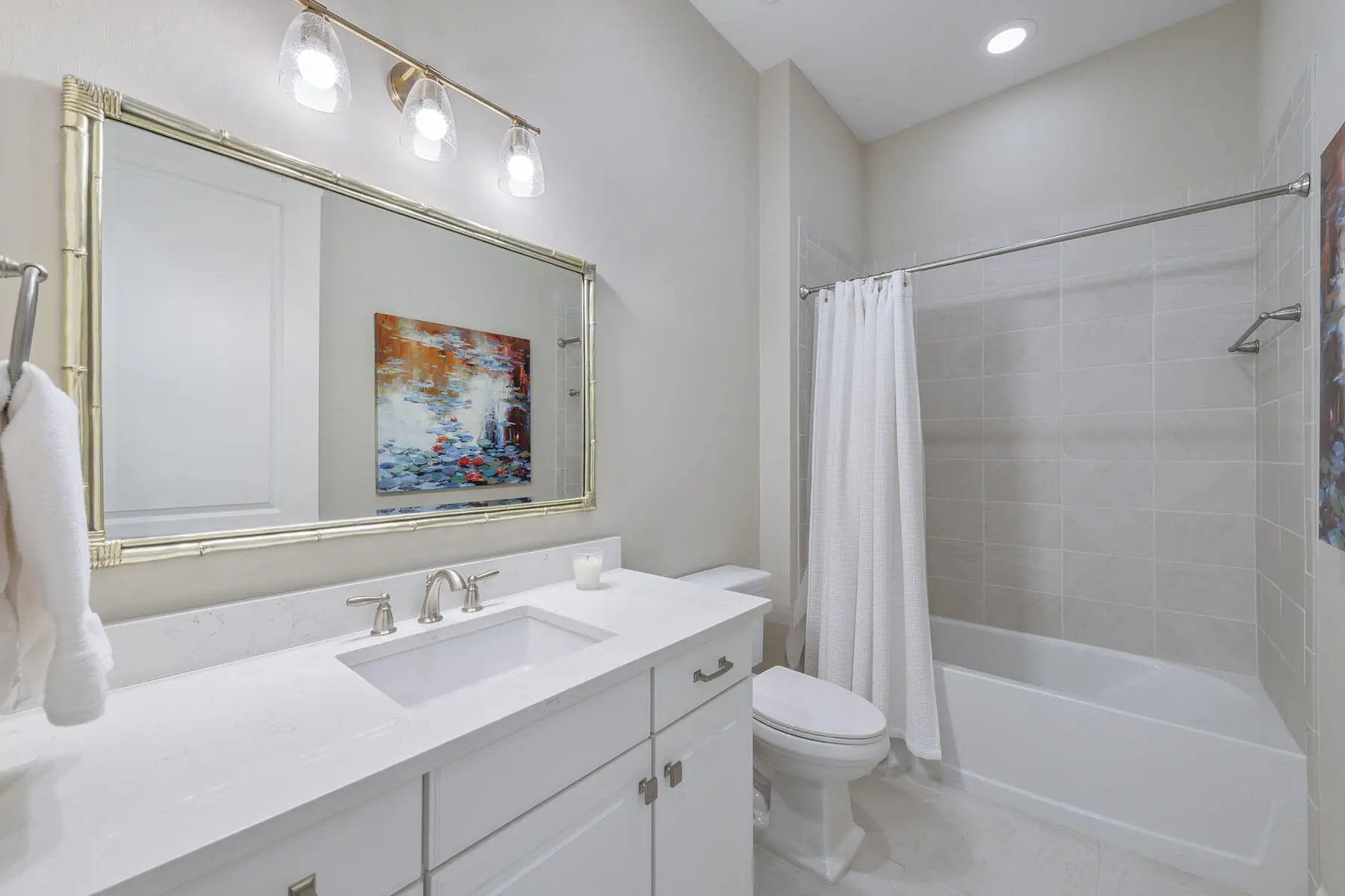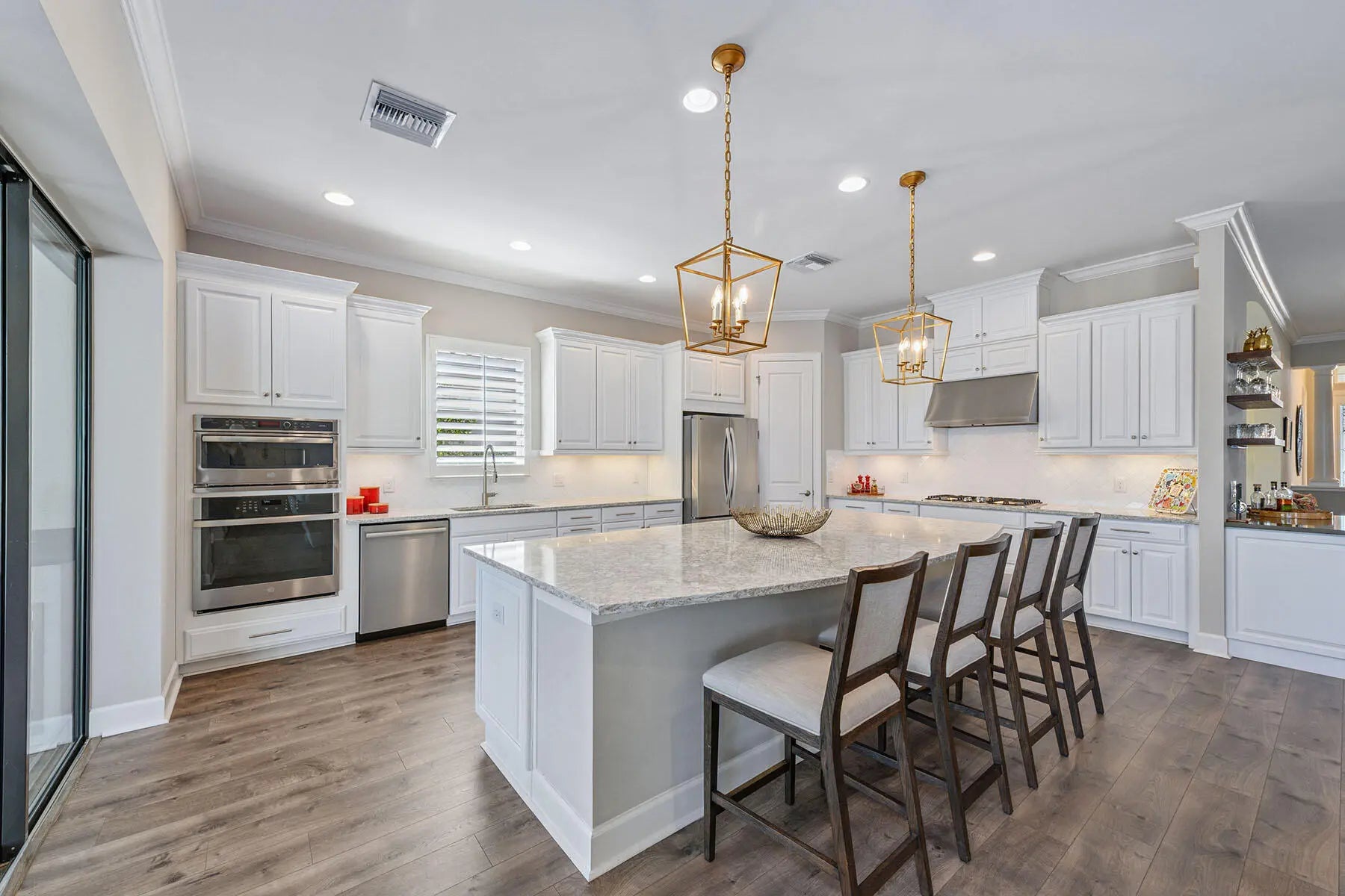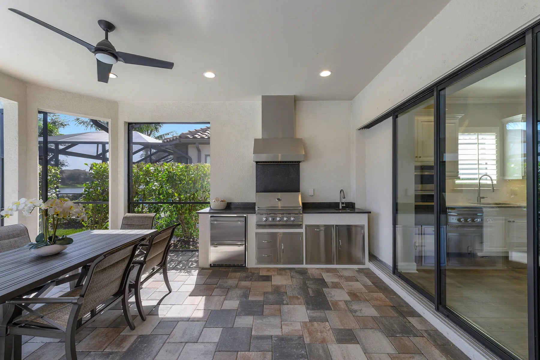 Enjoy peaceful lake views and a refined indoor-outdoor lifestyle in this popular Pallazio model, a stunning four-bedroom plus den, three-bath home built in 2019 in Oyster Harbor at Fiddler's Creek. Designed with a desirable open-concept layout and split-bedroom plan, the residence features a heated saltwater pool and spa with waterfall spillover, powered by a new Pentair gas heater. The picture-frame screen enclosure frames the tranquil waterfront, while the fully equipped summer kitchen includes a Somerset stainless steel grill with rotisserie, leathered granite countertops, and a 24-inch double drawer beverage refrigerator. Ideal for year-round enjoyment, the lanai also offers recessed lighting, ceiling fans, and in-ceiling speakers. Impact-resistant glass and manual shutters provide added peace of mind. Inside, a glass French door entry opens to a welcoming foyer with a tray ceiling, setting the tone for the elegant interior. Wood-look luxury vinyl plank flooring, crown molding, recessed lighting, and thoughtful upgrades carry throughout. The gourmet kitchen is a showpiece with white cabinetry, quartz countertops, an island with pendant lighting, tile backsplash, and under-cabinet lighting. Premium GE stainless appliances include a 36' five-burner gas cooktop and hood, Advantium microwave, wall oven, new Bosch dishwasher, new French door refrigerator/ freezer, and a pantry for added storage. The adjacent formal dining area features an elegant chandelier and flows seamlessly into the open-concept living room, creating a perfect space for entertaining. The living area is equally inviting with a recessed ceiling, accent wall, and a dry bar with floating shelves and a Monogram glass-front beverage fridge, all overlooking the lanai through sliding glass doors. The owner's suite is a private retreat overlooking the lake, with a tray ceiling, white plantation shutters, and a luxurious en-suite bath. Highlights include a quartz dual-sink vanity with makeup counter, sconce lighting, a large glass-enclosed walk-in shower with multiple shower heads, a window for natural light, and a spacious walk-in closet with custom built-ins. The guest area includes three bedrooms, each with plantation shutters and wood slat closet shelving. Two guest rooms share a full bath with a tub/shower combination, while the third offers an en-suite with a walk-in shower and glass enclosure. A flexible den with ceiling fan makes the perfect home office or study. The laundry room includes GE front-load washer and gas dryer on pedestals, a utility sink, cabinetry, and counter space. The two-car garage features an epoxy floor, and the home is equipped with a tankless gas water heater and a security system. Residents enjoy access to an impressive clubhouse with fine/ casual dining, a fitness center with classes, resort-style pools with waterfalls/ slides, spa, sauna, steam room, tennis, pickleball, bocce, and year-round events. Optional golf, beach and marina memberships available.