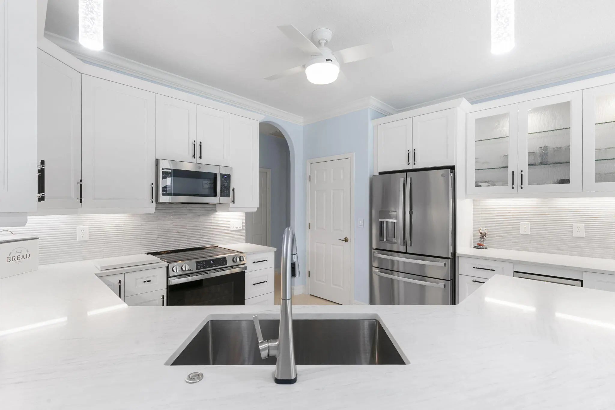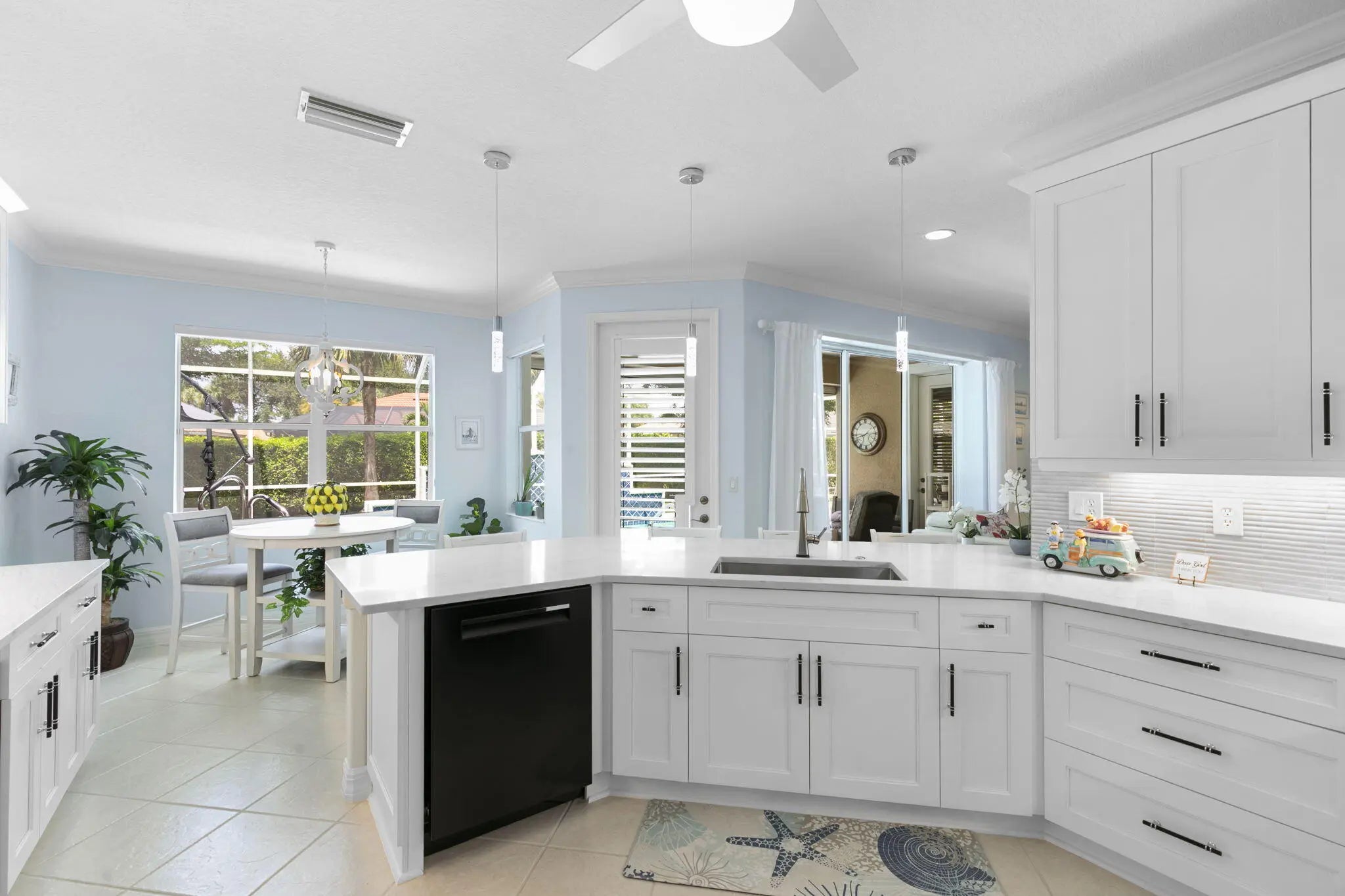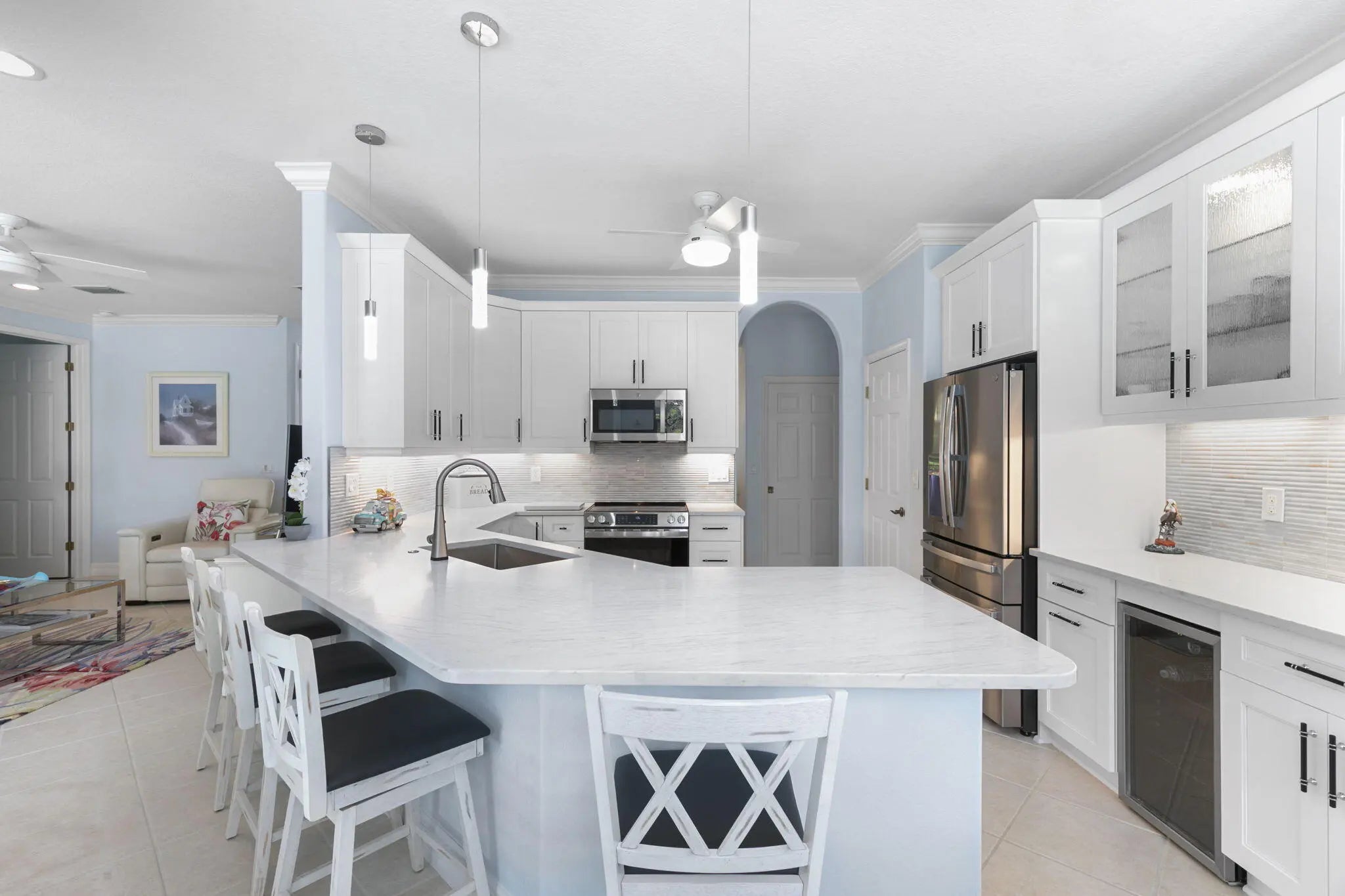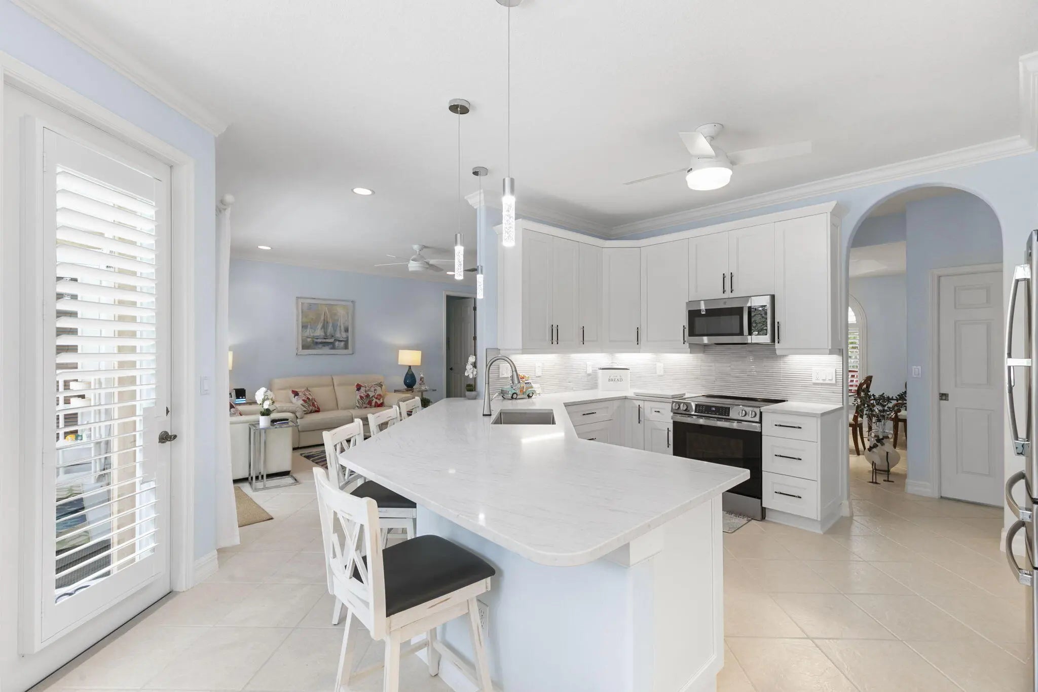 Discover elegance and comfort in this updated home located in the gated community of Forest Park. Enjoy a private pool and spa with a custom water feature, screened lanai with northern exposure, and remote-controlled storm shades for convenience and protection. Fresh paint, new luxury vinyl flooring, and a split-bedroom floor plan create a modern, move-in-ready feel. A versatile den with bamboo glass French doors offers the perfect office or flex space. The kitchen, fully remodeled in 2025, shines with brand-new white shaker cabinets, quartz countertops, under-cabinet lighting, pantry, breakfast nook, and all new stainless steel appliances. A formal dining room with crown molding provides the ideal space for entertaining. The spacious primary suite offers lanai access, a soaking tub, walk-in shower, dual vanities, and custom closets. Additional updates include a brand-new guest shower, new AC, new washer/dryer, and hurricane-impact windows. Forest Park residents enjoy resort-style amenities including a clubhouse, fitness center, billiards room, and community pool. Just minutes from downtown Naples, world-class beaches, shopping, and dining, this home perfectly balances tranquility and convenience.