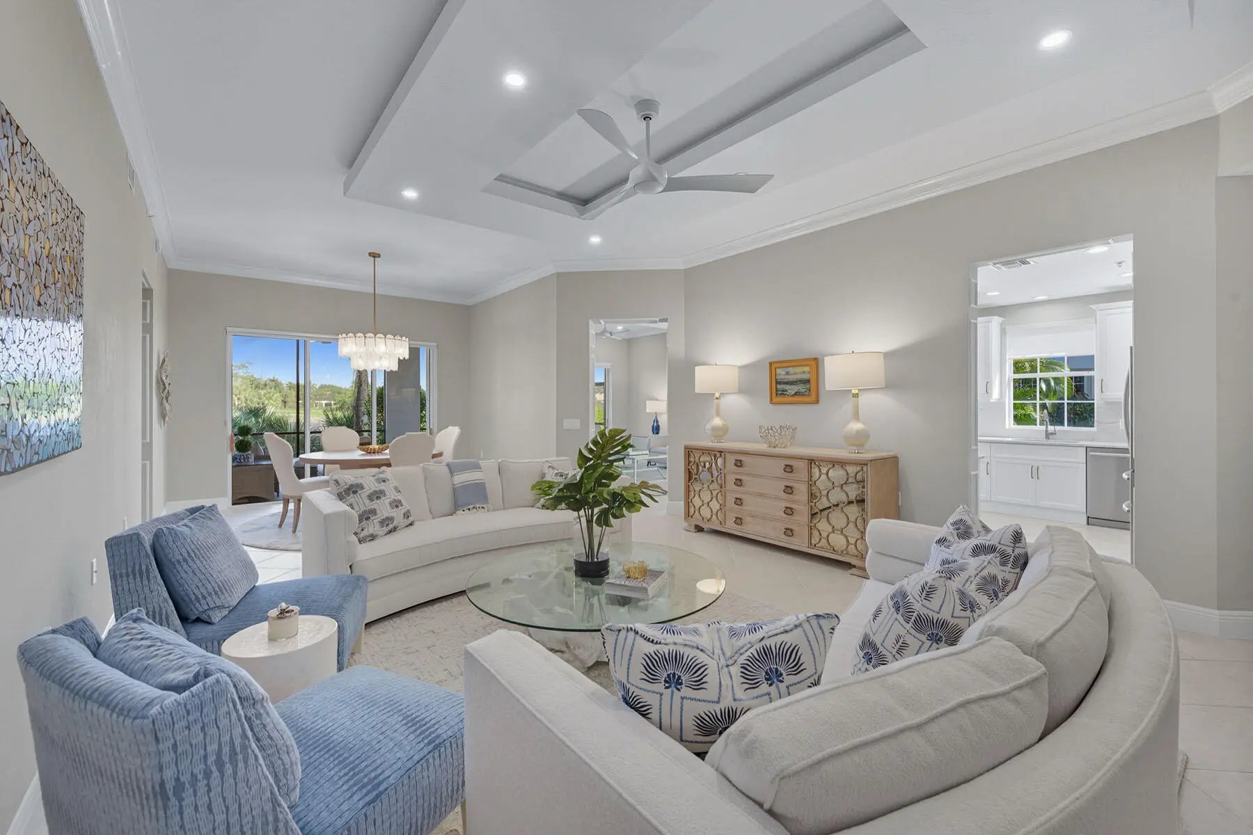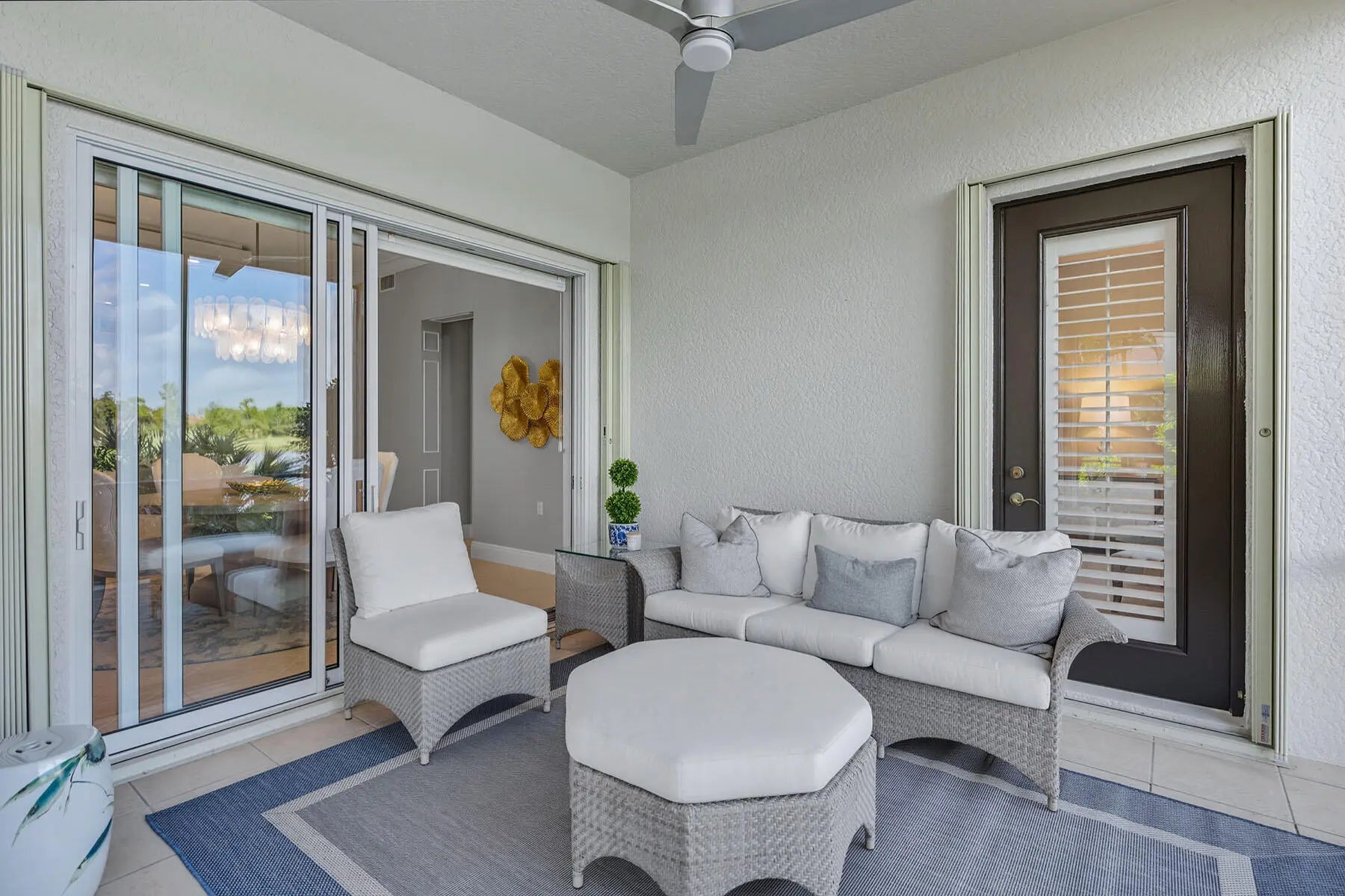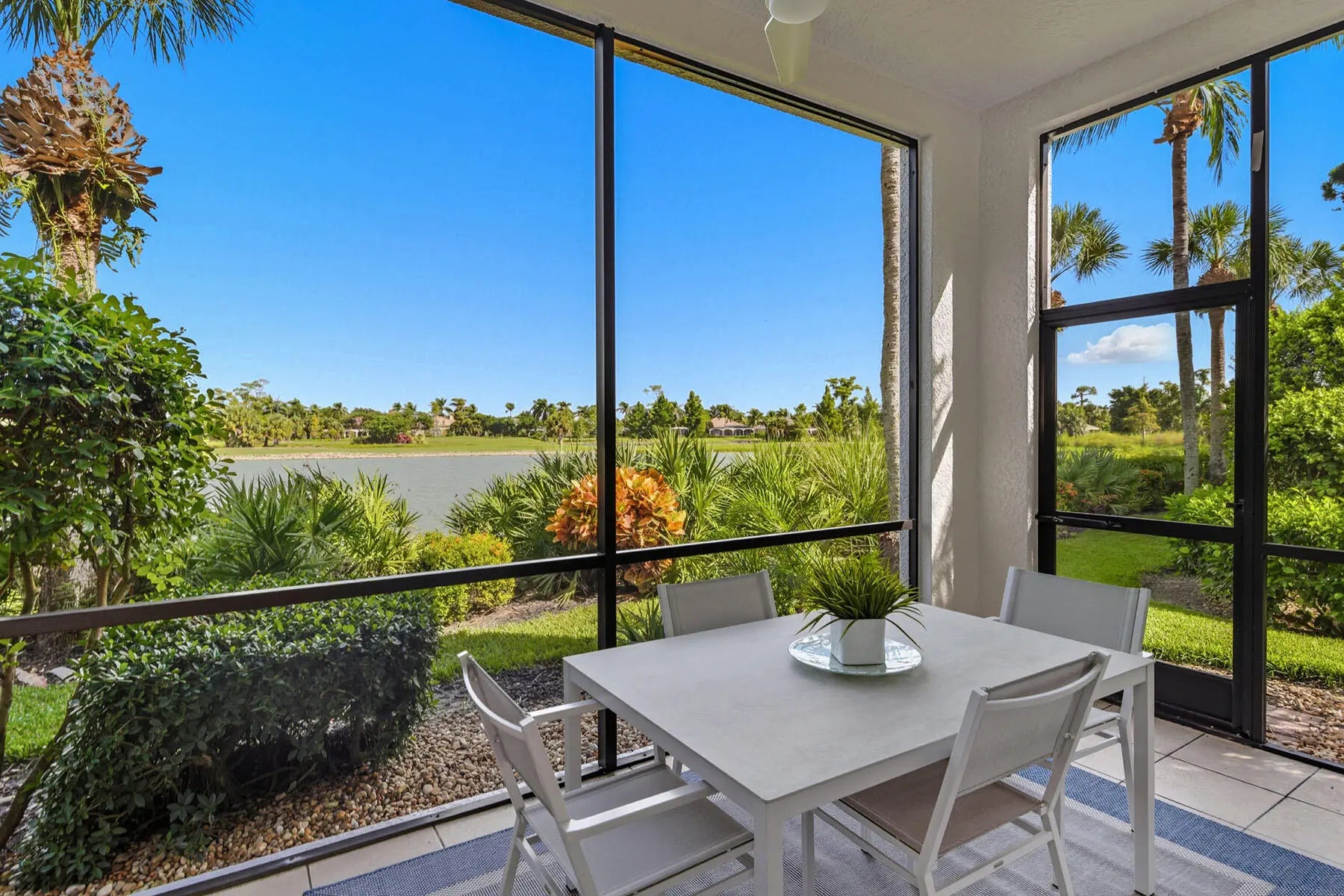 Experience refined coastal living in this beautifully renovated first-floor residence, perfectly positioned to capture tranquil lake and golf course views within the coveted Montreux enclave of Fiddler's Creek. Designed with elegance and livability in mind, this spacious three-bedroom, three-bath home lives like a single-family residence, offering a private entrance, attached two-car garage, and an open, light-filled layout. The gourmet kitchen impresses with quartzite countertops and backsplash, white cabinetry, stainless steel appliances, and a charming breakfast nook overlooking lush tropical gardens. Each of the three bathrooms has been completely renovated, showcasing elegant finishes, modern tilework, and spa-like details throughout. The serene owner's suite opens to the lanai and features dual walk-in closets and a beautifully updated bath with a soaking tub and frameless glass shower. Additional enhancements include a freshly painted interior, designer lighting, and a brand-new HVAC system, creating a move-in-ready retreat that blends comfort and modern sophistication. A screened lanai provides the ideal setting for morning coffee or evening gatherings, framed by sweeping water and golf vistas. Montreux is currently undergoing a community-wide landscaping enhancement, further elevating the neighborhood's beauty and appeal. Residents enjoy access to the award-winning Fiddler's Creek Club & Spa, offering fine and casual dining, resort-style pools, a full-service fitness center, spa, tennis, pickleball, and an active social calendar. Optional golf, beach, and marina memberships further enhance the unparalleled Florida lifestyle this residence affords.
