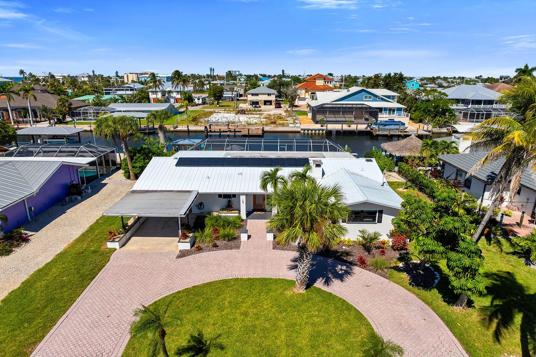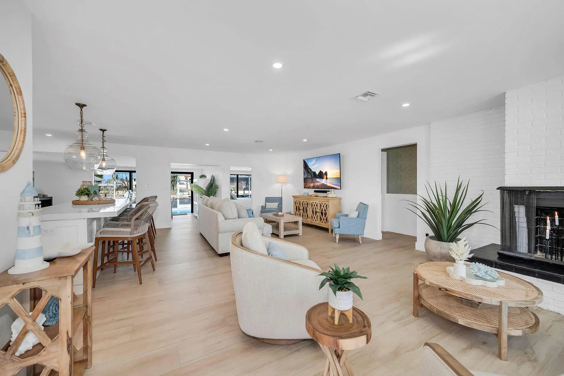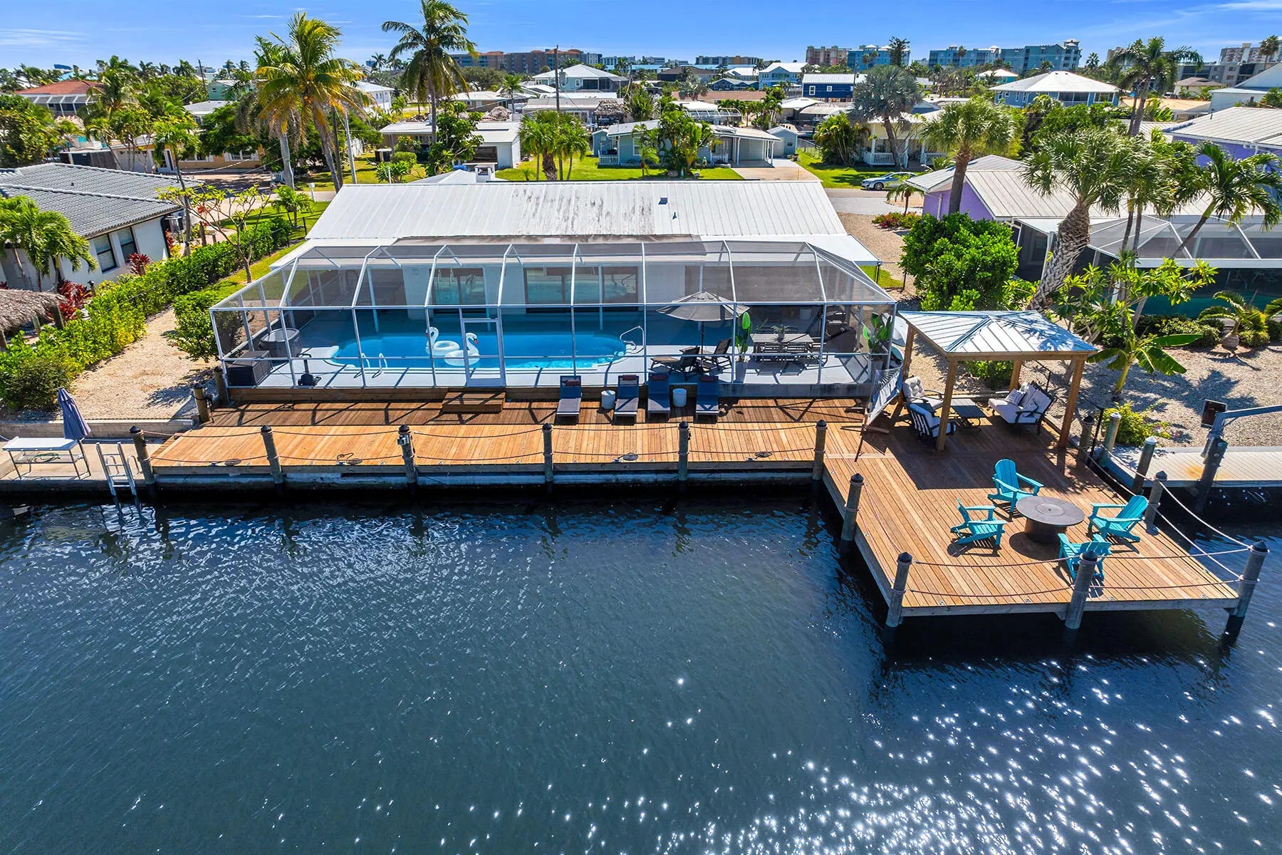 Experience the ultimate coastal lifestyle in this beautifully updated canal-front home in the desirable Sandpiper Village community of Fort Myers Beach. Set on a rare double lot, this residence offers easy canal access for boating directly to the Gulf along with a deeded walkway to the white sandy beach—delivering the best of both worlds for water enthusiasts. Designed for relaxed island living, this move-in-ready retreat has been completely modernized with new stainless steel appliances, impact-rated doors and windows, a metal roof, and stylish interior finishes that complement its open, airy layout. Inside, the home features three bedrooms plus a den, and two baths, offering flexible living spaces ideal for guests, a home office, or media room. The open kitchen is a showpiece, boasting modern cabinetry, quartz countertops, a tile backsplash, an island with bar seating, and premium appliances including a paneled range hood, under-counter microwave, dishwasher, refrigerator with icemaker, and a wine cooler. The adjacent dining area flows seamlessly to the screened lanai through sliding glass doors, creating effortless indoor-outdoor living. A cozy living room highlighted by a brick feature wall and fireplace adds warmth and character, while wood-look laminate tile flooring, recessed lighting, and custom wall trim elevate the home's modern coastal charm. The thoughtfully designed floor plan includes three bedrooms with closets, complemented by a versatile den that easily functions as a home office, media room, or optional guest space. One of the larger bedrooms features an adjacent bath with a sleek vanity and a walk-in shower tiled floor-to-ceiling with a glass enclosure. The second bath mirrors the same modern design with a contemporary vanity, LED mirror, and walk-in shower. The attached garage is finished with epoxy flooring and air conditioning, designed as a game room or entertainment space with access to both the driveway and lanai. Step outside to your private waterfront oasis, complete with a heated saltwater pool, a large covered screened lanai, and a spacious dock with a charming gazebo and ceiling fan—ideal for relaxing, fishing, or enjoying evening sunsets. For added peace of mind, the property includes flood barrier protection designed to help prevent rising water intrusion during storms, along with transferable flood insurance. The circular brick paver driveway and lush landscaping enhance curb appeal, while the private boat dock with Gulf access makes this home a boater's dream. Offering a rare blend of privacy, luxury, and convenience with no HOA, this property also provides excellent investment potential as a vacation rental or personal coastal retreat.