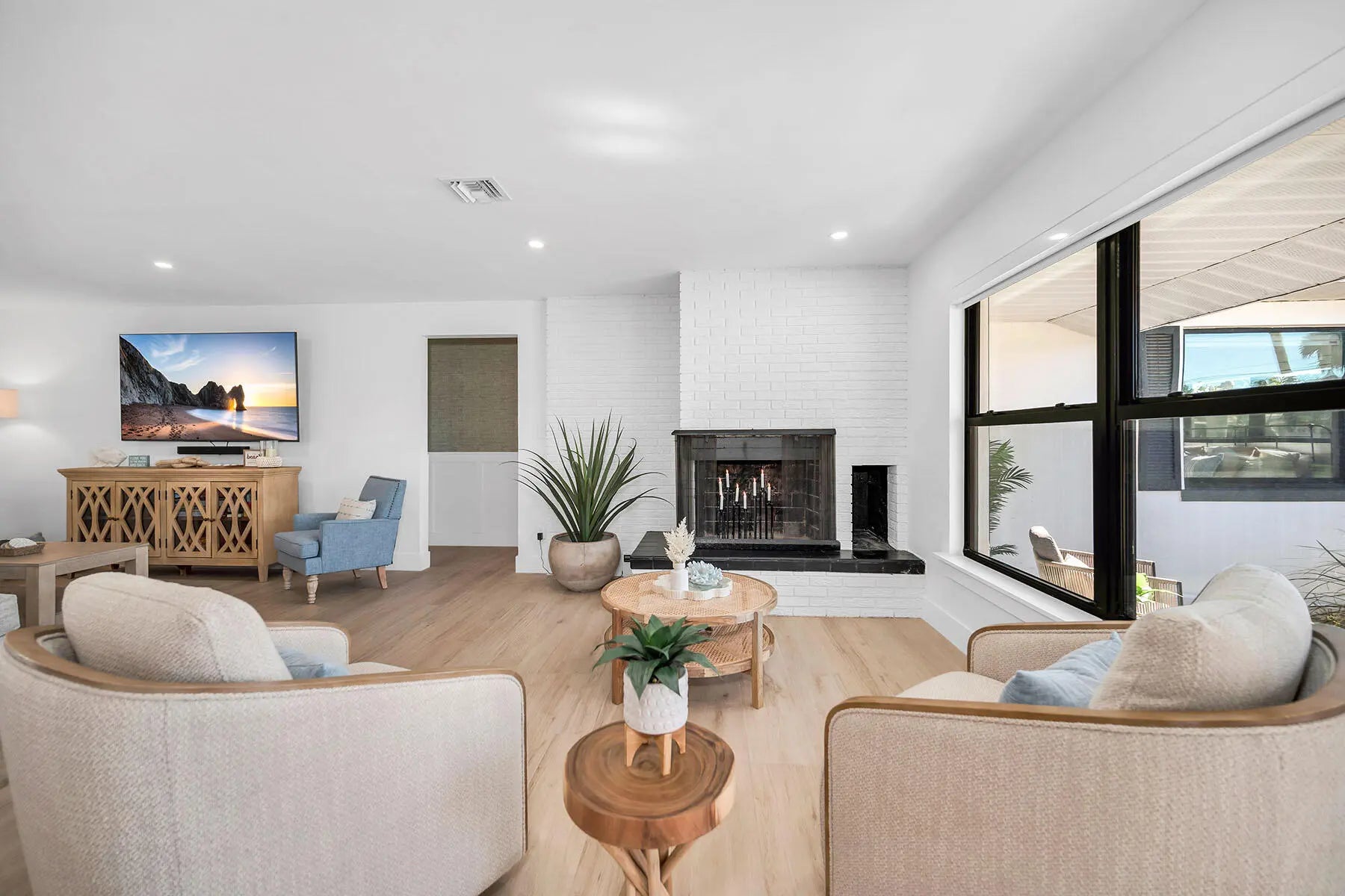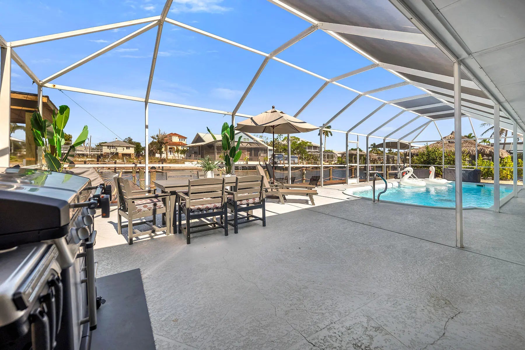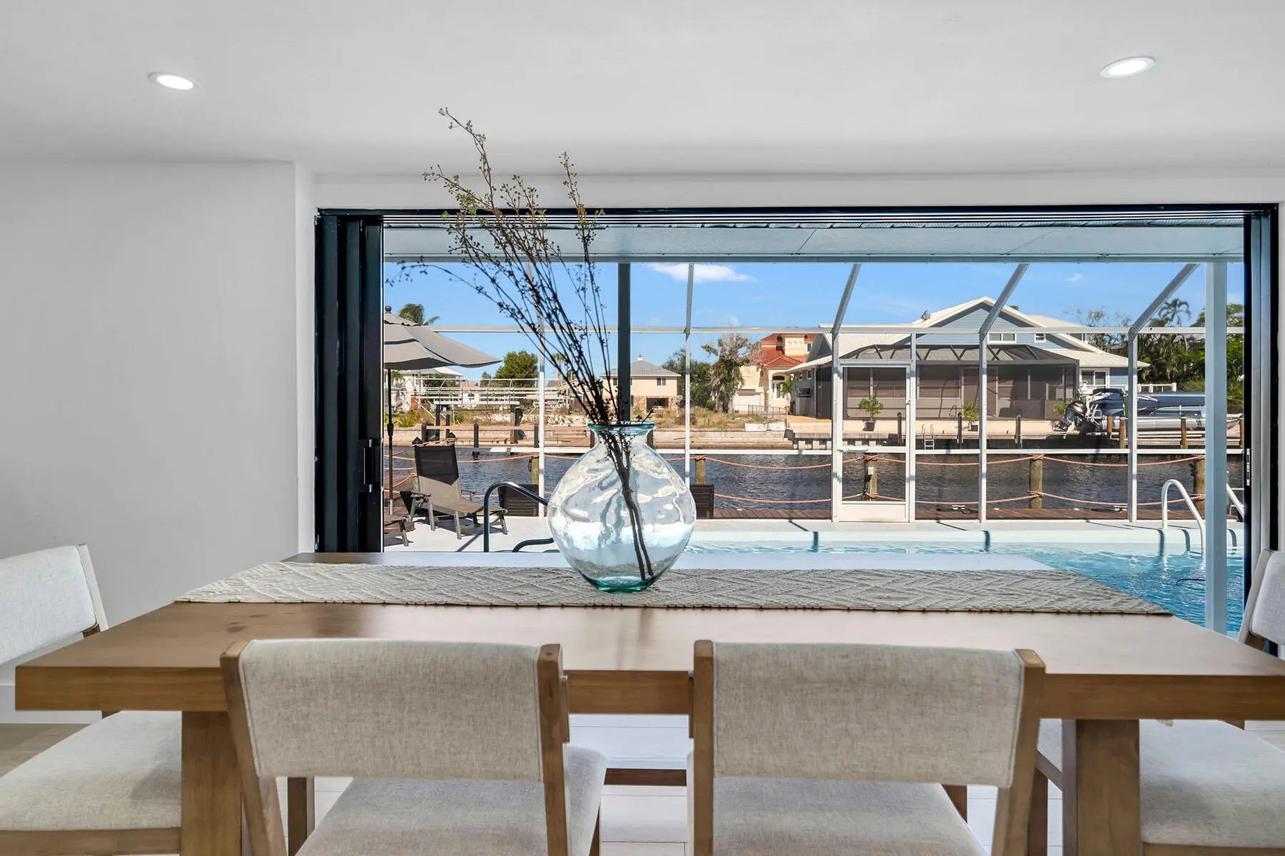 Experience the ultimate coastal lifestyle in this beautifully updated canal-front home in the desirable Sandpiper Village community of Fort Myers Beach. Set on a rare double lot, this residence offers easy canal access for boating directly to the Gulf along with a deeded walkway to the white sandy beach—delivering the best of both worlds for water enthusiasts. Designed for relaxed island living, this move-in-ready retreat has been completely modernized with new stainless steel appliances, impact-rated doors and windows, a metal roof, and stylish interior finishes that complement its open, airy layout. Inside, the home features three bedrooms plus a den, and two baths, offering flexible living spaces ideal for guests, a home office, or media room. The open kitchen is a showpiece, boasting modern cabinetry, quartz countertops, a tile backsplash, an island with bar seating, and premium appliances including a paneled range hood, under-counter microwave, dishwasher, refrigerator with icemaker, and a wine cooler. The adjacent dining area flows seamlessly to the screened lanai through sliding glass doors, creating effortless indoor-outdoor living. A cozy living room highlighted by a brick feature wall and fireplace adds warmth and character, while wood-look laminate tile flooring, recessed lighting, and custom wall trim elevate the home's modern coastal charm. The thoughtfully designed floor plan includes three bedrooms with closets, complemented by a versatile den that easily functions as a home office, media room, or optional guest space. One of the larger bedrooms features an adjacent bath with a sleek vanity and a walk-in shower tiled floor-to-ceiling with a glass enclosure. The second bath mirrors the same modern design with a contemporary vanity, LED mirror, and walk-in shower. The attached garage is finished with epoxy flooring and air conditioning, designed as a game room or entertainment space with access to both the driveway and lanai. Step outside to your private waterfront oasis, complete with a heated saltwater pool, a large covered screened lanai, and a spacious dock with a charming gazebo and ceiling fan—ideal for relaxing, fishing, or enjoying evening sunsets. For added peace of mind, the property includes flood barrier protection designed to help prevent rising water intrusion during storms, along with transferable flood insurance. The circular brick paver driveway and lush landscaping enhance curb appeal, while the private boat dock with Gulf access makes this home a boater's dream. Offering a rare blend of privacy, luxury, and convenience with no HOA, this property also provides excellent investment potential as a vacation rental or personal coastal retreat.