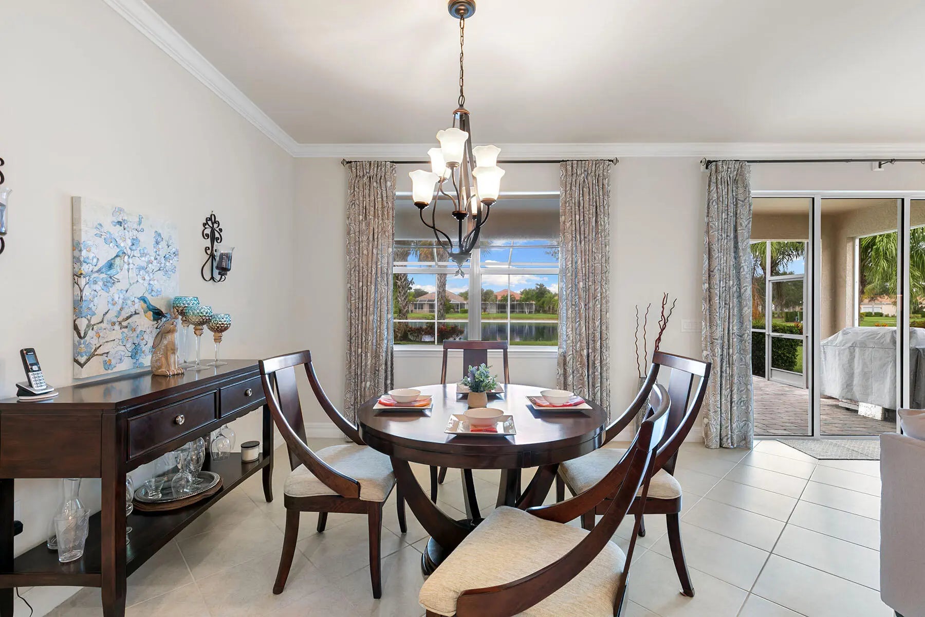 This beautifully appointed Tifton model features three bedrooms plus a spacious den and two full baths. The residence offers a paved lanai with sparkling saltwater pool that overlooks a tranquil lake, providing the setting for enjoying spectacular stunning sunsets from the comfort of your screened lanai. Wonderful open concept design seamlessly connects the eat-in kitchen, breakfast bar, walk-in pantry, formal dining area and living room, making it ideal for entertaining guests. Tiled flooring runs throughout the entire home, adding to its modern appeal. The split bedroom plan offers privacy for owners and guests, with the primary suite set apart from the guest bedrooms which includes an en-suite bath featuring double sinks, a soaking tub, walk-in shower and a spacious walk-in closet. Separate laundry room is in the house and generous den area with doors for privacy, ideal for a home office or quiet retreat. Residents of Verona Walk enjoy access to an impressive array of amenities with Har-Tru tennis courts, bocce, pickleball and basketball court, fitness center, two pools, including a lap pool, over 22 miles of recreational and biking paths, 24-hour guarded gate for security, onsite post office, travel agency, salon, car wash and café, Full-time activities director, and multiple community rooms and a library offering plentiful entertainment options. It is conveniently in downtown Naples's 5th Avenue offering an abundance of art galleries, fine dining, shopping and stunning sandy white beaches. Near Marco Island and easy access to Interstate 75. HOA dues include lawn care and irrigation, basic cable TV. This is more than just a home, it's a way of life.