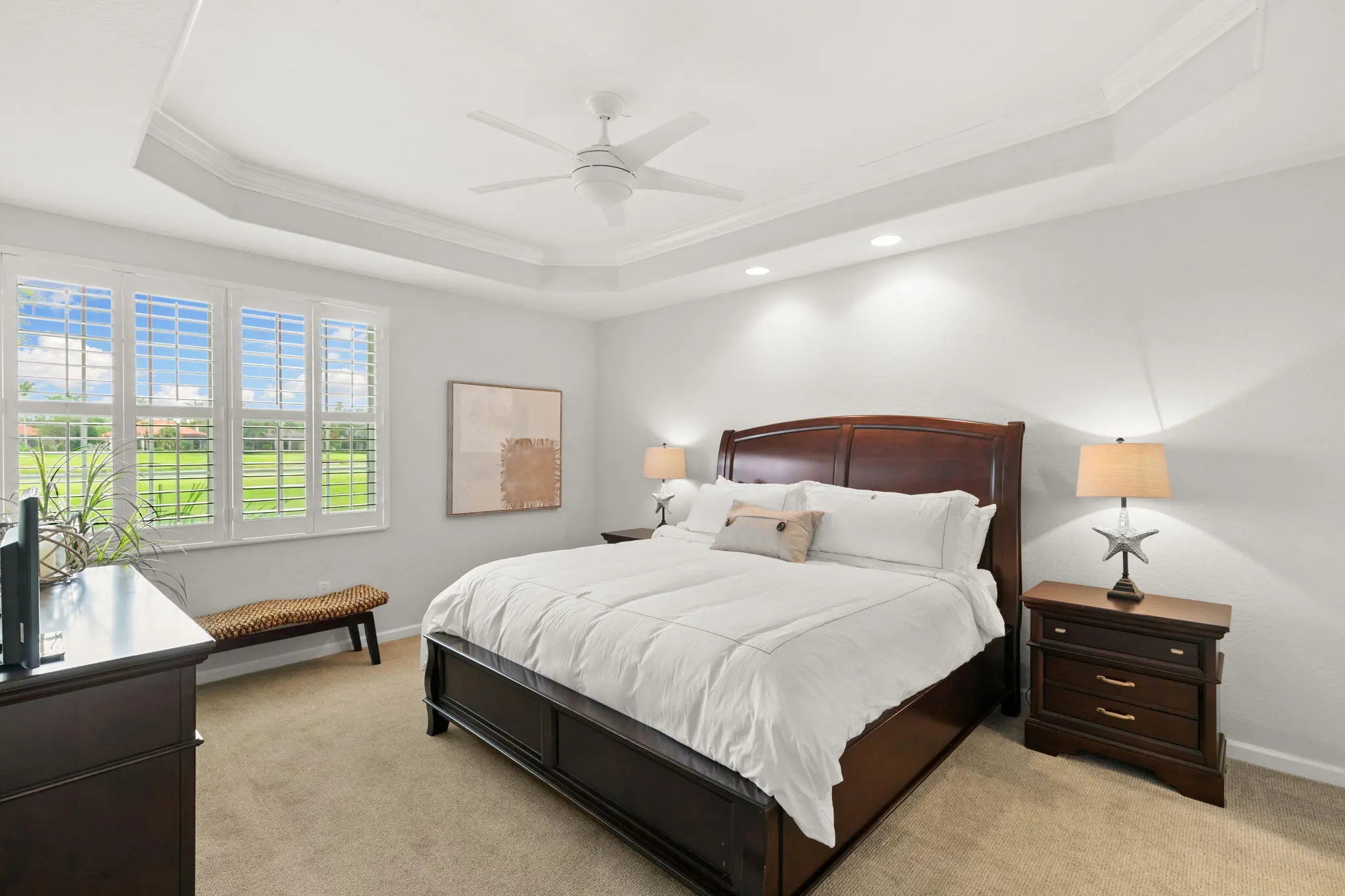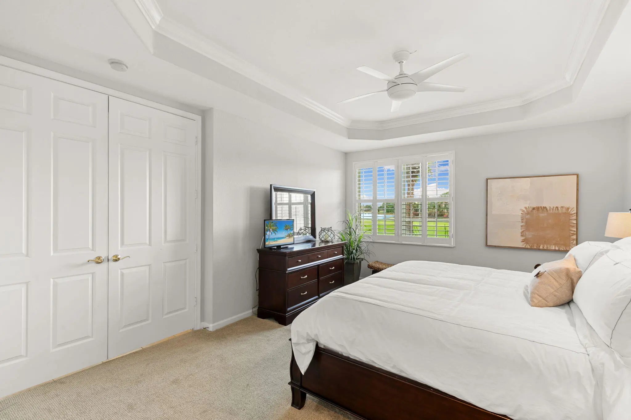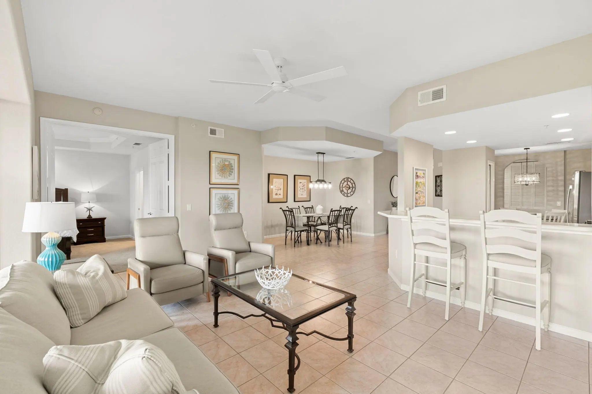 Welcome to this light, bright & meticulously maintained first-floor condo in the beautiful Fiddler's Creek! This stunning 3-bedroom, 2-bath residence offers serene south-facing golf course and water views and an abundance of natural light throughout. The spacious kitchen features an eat-in kitchenette, breakfast bar, adjacent formal dining area, stainless steel GE appliances (2024), chic white cabinetry and a gas range—perfect for both casual and formal dining. The open-concept living area flows seamlessly into the expansive lanai, creating an inviting space for entertaining or relaxing. Retreat to the elegant primary suite which is enhanced by its tray ceiling, crown moulding, and your own private golf course and water views. The plantation shutters, walk-in closet, and dual vanities provide additional charm and comfort. The updated lighting fixtures throughout, newer Maytag washer & dryer, plantation shutters throughout, and a newer HVAC and air handler (2024) offer style and utility to an already gorgeous home. Enjoy the convenience of an attached one-car garage and inviting courtyard entry way. The debt service portion of the CDD IS PAID IN FULL. The award-winning, resort style community of Fiddler's Creek is enhanced by a club and spa, fitness center, swimming pools, two golf courses, tennis courts, pickleball courts, a bocce court, fine and casual dining, social activities, and miles of biking and walking paths. Optional beach club and marina memberships are available. Experience the epitome of luxury living, where every detail is thoughtfully curated to complement your lifestyle.