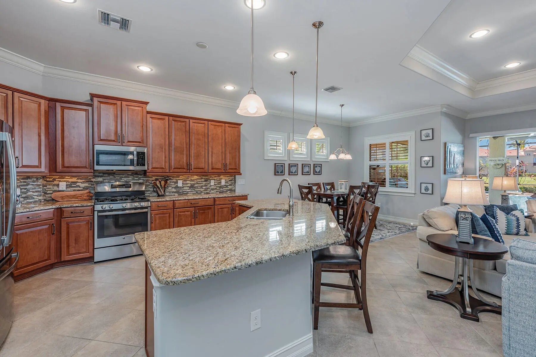 Experience serene lakeside living in this beautifully maintained residence in Amador at Fiddler's Creek, offering western exposure, tranquil water views, and lush tropical landscaping. This single-family pool and spa home combines comfort, elegance, and modern upgrades throughout, featuring 3 bedrooms plus a den, 2 full baths, and a 2-car garage. Furnishings are available and negotiable. A wide brick paver driveway and inviting entry set the tone for the refined interior, where an open great room floor plan, crown molding, tray ceilings, plantation shutters, diagonal tile flooring, arched walkways, and recessed lighting add warmth and sophistication. The open kitchen is designed for both function and style, showcasing quality cabinetry, granite countertops, a mosaic tile backsplash, under-cabinet lighting, a pantry, pendant lighting over the island with breakfast bar, and stainless-steel appliances, including a gas range, French-door refrigerator, newer microwave, and dishwasher. A nearby formal dining space creates effortless flow for everyday living and entertaining. The great room features sliding glass doors that extend the living space outdoors to the expansive screened lanai. Enjoy a true Florida lifestyle on the lanai with a heated pool and spa with a waterfall feature, outdoor kitchen with built-in grill, and water views surrounded by tropical greenery. Impact windows provide peace of mind year-round. The owner's suite offers hardwood flooring, two walk-in closets, and a well-appointed bath with a dual vanity, makeup counter, full-width mirror, walk-in shower with frameless glass enclosure, and a separate soaking tub. The den with French doors and hardwood floors serves perfectly as a home office or study. Two guest bedrooms share an adjacent bath featuring a walk-in shower and glass enclosure, ensuring comfort and privacy for visitors. The laundry room includes overhead cabinets, a utility sink, and a 2022 Samsung washer and dryer, while the garage is enhanced by a mini-split system (garage AC unit) for added comfort. Additional upgrades include a 2022 HVAC system, newer ADT security system, Ring doorbell camera, smart WiFi deadbolt, iAquaLink pool and spa automation, LED pool-deck lighting, new smoke and CO detectors, and FPL surge protection. Residents of Fiddler's Creek enjoy an unparalleled resort experience with a world-class fitness center, active tennis and pickleball programs with 10 new pickleball courts, expansive updated resort-style pools, hot tub, sauna, steam room, and exceptional fine and casual dining options, including the recently renovated pool-side restaurant. Optional memberships, without a waiting list for golf, include the newly renovated championship golf course, the stunning brand-new golf clubhouse, a marina, and a private beach club. Ideally located minutes from Naples and Marco Island's pristine beaches, upscale shopping, and fine dining, this home offers the ultimate in FL luxury living. Seller has transferable flood insurance!