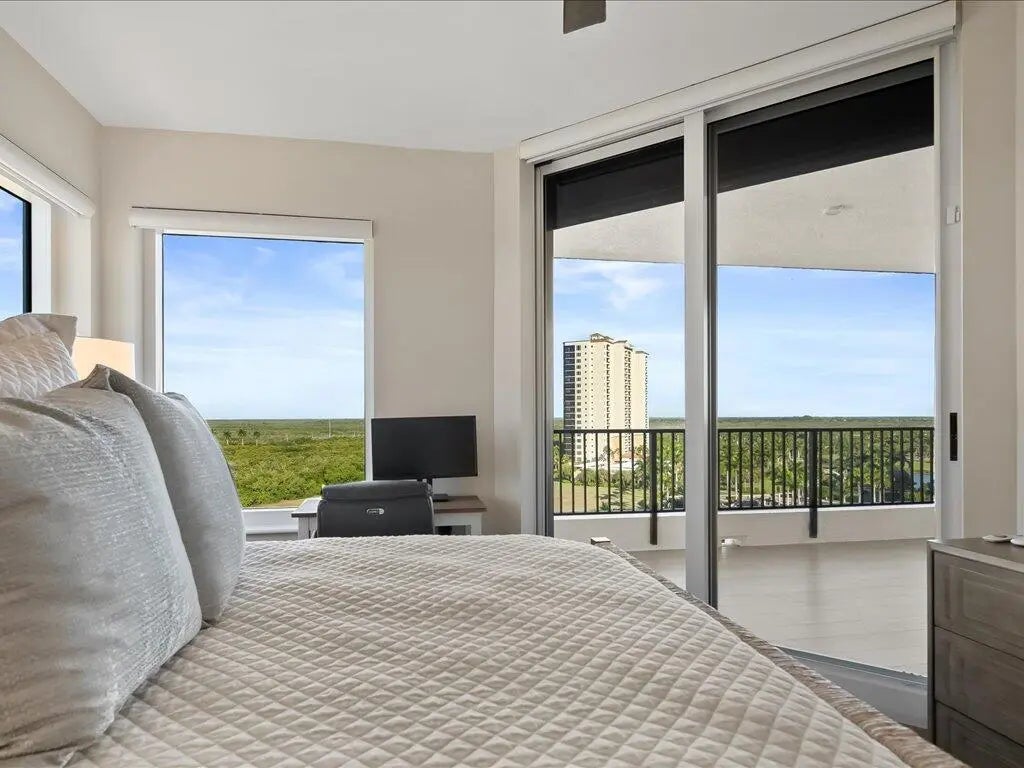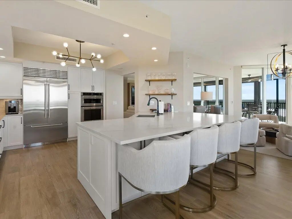 WOW! YOU HAVE NEVER SEEN A SKY HOME OF THIS MAGNITUDE AT HAMMOCK BAY. THIS RESIDENCE HAS BEEN COMPLETELY TRANSFORMED BOTH IN INFRASTRUCTURE AND AESTHETIC APPEAL. A PROFESSIONAL INTERIOR DESIGNER WAS USED HERE FOR ALL NEW FURNITURE, RUGS, AND DECOR THROUGHOUT INCLUDING ONE OF A KIND ARTWORK HAND PICKED FOR EACH SPACE. AS YOU STEP OFF THE PRIVATE ELEVATOR YOU WILL SEE GORGEOUS PORCELAIN TILE THROUGHOUT. THE KITCHEN WAS OPENED UP WITH AN MASSIVE QUARTZ ISLAND WITH ADDITIONAL STORAGE UNDERNEATH, STATE OF THE ART APPLIANCES, GRANITE SINK, LIVE EDGE WOOD SHELVING, WATER FILTRATION, ALL NEW HARDWARE AND PULLOUTS. JUST OFF THE KITCHEN IS A UNIQUE LIVE EDGE TABLE WITH ALL NEW POSH WINDOW SEATING WITH ADDITIONAL STORAGE. LOCATED IN THE FAMILY ROOM IS A CUSTOM BUILT IN BAR WITH LEATHERED CHISELED EDGE GRANITE COUNTER, FULL SIZE WINE REFRIGERATOR, REFRIGERATOR DRAWERS, GLASS SHELVING, AND ALSO FEATURES A WALL WINE RACK WITH DECORATIVE ART GLASS LED WALL SCONCES. THE SPACIOUS LIVING ROOM WITH WINDOW WALLS SHOWCASES A HAND CRAFTED BUILT IN WALL UNIT WITH A LINEAR 82' ELECTRIC FIREPLACE AND LIGHTED WOOD SHELVING WITH A 75' TV WITH SOUND BAR. THE LUXURIOUS PRIMARY SUITE HAS A DESIGNER KING BED AND HANGING 65' TV WITH SOUND BAR. THE CLOSETS IN THIS SUITE HAVE PROFESSIONAL BUILT IN DRESSERS AND MIRRORS. ON THE OTHER END OF THIS SPACIOUS CONDO IS 3 ADDITIONAL BEDROOMS AND 2 LUXURIOUS BATHROOMS. THE FOURTH BEDROOM HAS A BUILT IN DESK WITH LEATHERED GRANITE COUNTERTOP, WINDOW SEAT, STORAGE DRAWERS AND A MOUNTED 55' TV WITH SOUND BAR. THE POWDER ROOM WILL SURELY IMPRESS WITH THE ONE OF A KIND SINK AND MATCHING DECOR. ADDITIONALLY THE RESIDENCE HAS GUARDIAN ELECTRIC SHUTTERS ON THE LANAI AND BOTH OPEN LANAIS, AND HUNTER DOUGLAS PIROUETTE ELECTRIC WINDOW SHADES ON EVERY WINDOW. LESINA IS A 5 STAR LUXURY TOWER WITH AMENITIES INCLUDING RESORT STYLE POOL AND SPA, POOL PAVILION, DOG PARK, GRAND SALON, LIBRARY, SOCIAL ROOM, THEATER, FITNESS CENTER, UNDER BUILDING PARKING STORAGE AND MORE.