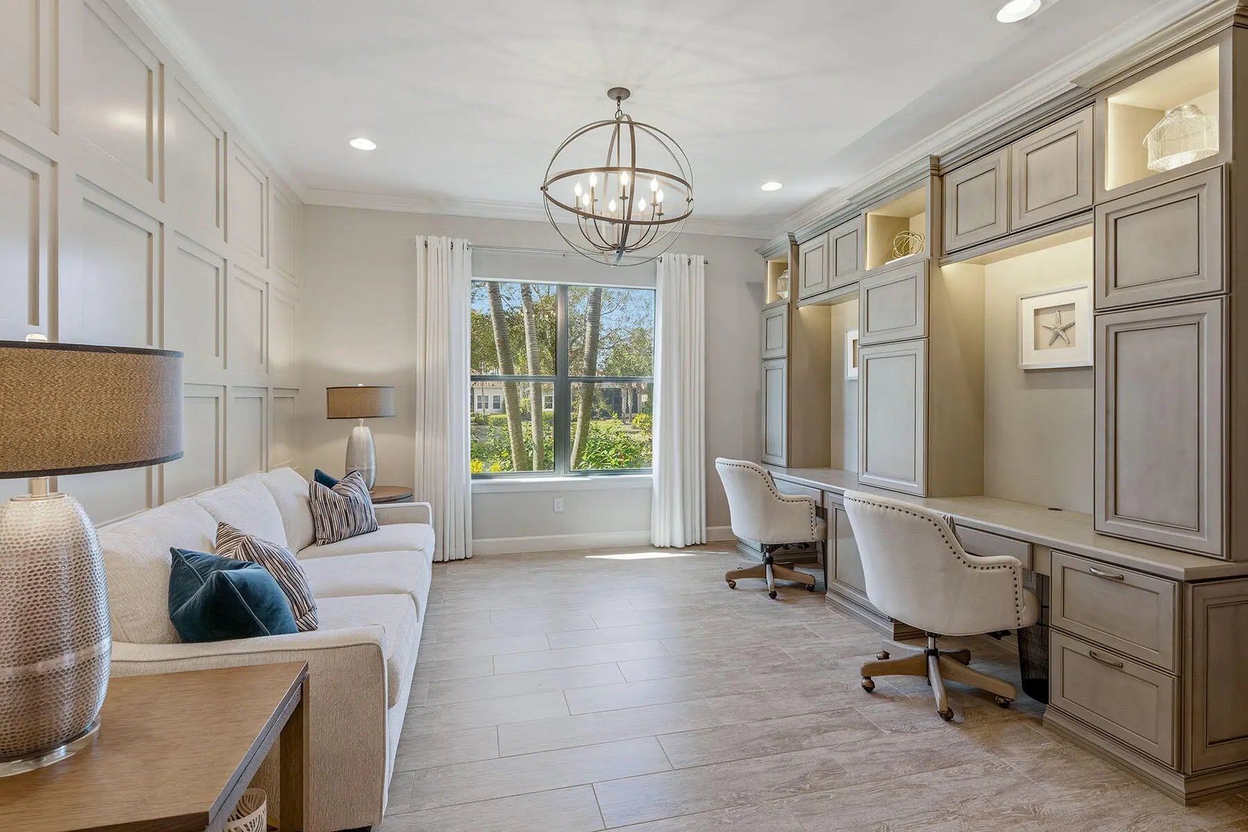 Nestled at the end of a quiet cul-de-sac in highly regarded Oyster Harbor, this lushly landscaped, beautifully furnished, extensively upgraded residence occupies an exceptional homesite with coveted southern and western exposures, filling the home with natural light and showcasing sweeping panoramic lake views and breathtaking sunsets. Surrounded by water on two sides and with no neighboring home directly to the right, the setting offers remarkable privacy and lives like a private peninsula-a rare combination within the community. The location offers both tranquility and convenient access to world-class amenities. Designed for seamless indoor-outdoor living, the Palazzio floor plan features 3 bedrooms plus a study and 3 full baths, blending refined finishes with thoughtful upgrades in a serene waterfront setting. Exterior highlights include a pavered driveway, tile roof and a gorgeous outdoor space including a heated saltwater pool and spa with cascading water features. The screened lanai offers a picture-window enclosure, summer kitchen with granite bar, five-burner grill, refrigerator, gas fireplace, in-ceiling speakers and dual ceiling fans-ideal for sunset entertaining. Impact windows, pocketing sliders and an electric storm screen provide protection and privacy, while landscape lighting, security system, tankless gas water heater and a 32KW liquid-cooled whole-house generator add peace of mind. Inside, 35x8 wood-look porcelain tile flows throughout, enhanced by crown molding and arched walkways. The living room features a coffered ceiling with crown detail and accent lighting, recessed wall detail, LED lighting, in-ceiling speakers and soaring 10 ½ ft ceilings that enhance the open feel, while the dining area continues the elegant finishes. The kitchen is appointed with quartz countertops, glass tile backsplash, large island, under-cabinet lighting and walk-in pantry, along with premium stainless appliances including a five-burner natural gas cooktop with griddle and hood, wall microwave and convection oven, dishwasher, French-door refrigerator, wine cooler and separate ice maker. The primary suite offers a tray ceiling, crown molding, recessed lighting and in-ceiling speakers, opening to a spa-inspired bath with walk-through shower, rain head, quartz dual vanities and custom walk-in closet. Two guest bedrooms provide comfortable accommodations, one en-suite, with both guest baths featuring quartz vanities and walk-in showers. The den includes built-in desks and custom cabinetry, ideal for a home office. A well-equipped laundry room offers quartz counters, utility sink and cabinetry. The garage features a painted floor and water softener system. Residents enjoy a highly sought-after gated community with resort-style pools, fine and casual dining, fitness, pickleball, tennis, ample sidewalks for walking and bicycling, and a full array of activities and events. Optional golf, beach and marina memberships also available.