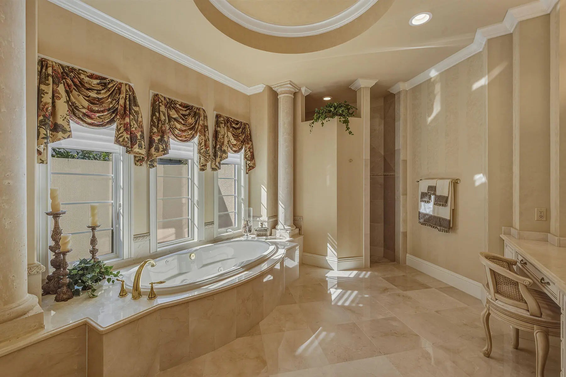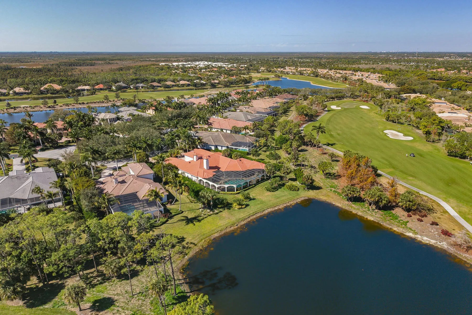 Gracefully positioned on an expansive .73-acre homesite within Isla del Sol--Fiddler's Creek's most prestigious and private enclave--this exceptional custom-built estate overlooks the renowned Rookery Golf Course with tranquil lake and sweeping fairway vistas, while coveted eastern rear exposure welcomes radiant sunrise skies across the outdoor living spaces. A sweeping circular drive enhances the grand arrival, complemented by lush tropical landscaping, a 2024 tile roof, and stately mahogany entry doors crowned by an arched transom and sidelights. Offering approximately 6,700 square feet of living area, this meticulously maintained residence features four bedrooms plus a private study, six-and-a-half baths, and a three-car garage, blending timeless craftsmanship with impressive scale. Inside, soaring ceilings--including a dramatic 13-foot living room--10-foot sliding glass doors and 8-foot interior doors create a gallery-like ambiance, while natural stone flooring laid on the diagonal with custom inlays, tray ceilings, crown molding, and in-ceiling speakers elevate the refined atmosphere. Walls of mitered glass frame breathtaking pool, lake, and golf course views from both the living and family rooms, the latter anchored by a gas fireplace and a granite-topped bar with Sub-Zero wine refrigeration, U-Line beverage refrigerator, ice maker, and custom cabinetry. Designed for culinary excellence, the chef's kitchen showcases Sub-Zero refrigeration, a Wolf six-burner gas cooktop, Dacor wall oven and warming drawer, Miele dishwasher, granite countertops, tumbled marble backsplash, custom appliance garages, a center island, walk-in pantry, and extensive task lighting. A double-door study with engineered hardwood flooring and a built-in granite desk adjoins a billiards area and full bath, offering flexibility for work or leisure. The primary suite is a private sanctuary featuring a fireplace, tray ceiling, wet bar with Sub-Zero under-counter refrigerator, dual custom walk-in closets, and a dedicated exercise or massage room opening to a secluded garden patio, while dual spa-inspired baths offer natural stone finishes, marble vanities, a jetted soaking tub, bidet, and frameless glass showers with dual shower heads. Guest accommodations include two en-suite bedrooms in the main residence and a private guest cabana with full kitchen, living area, and bath--ideal for extended stays or multigenerational living. Outdoor living is extraordinary, highlighted by a gas-heated infinity-edge pool and spa, summer kitchen with DCS grill and gas cooktop, tongue-and-groove ceiling, outdoor fireplace, and covered lanai overlooking the lake and Rookery fairways. Additional features include electric roll-down shutters, security system, central vacuum, tankless water heater, new HVAC (2024), oversized laundry room, and epoxy-finished three-car garage, completing this impeccably maintained estate embodying privacy, prestige, and the finest in Fiddler's Creek luxury living.
